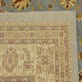 Classic Persian-inspired florals and scrolling vines are set against a light blue ground, creating a calm, traditional look. An ivory cream border of palmettes and rosettes frames the field, while accents of green, red, tan and brown add depth and subtle contrast. Machine made from 100% polypropylene, the rug has a low, dense pile with a soft, slightly velvety touch and a smooth surface that keeps the pattern crisp.