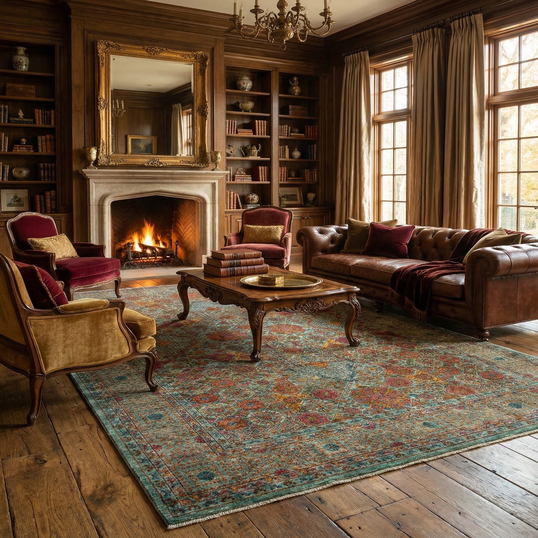 Suitable for a variety of interior settings, this piece can serve as the focal point in a living room, dining area, or large entryway. Its classic pattern seamlessly integrates with both contemporary and traditional decor, offering a timeless appeal. The composition of warm and cool colors allows for versatility in coordinating with a range of color schemes.
