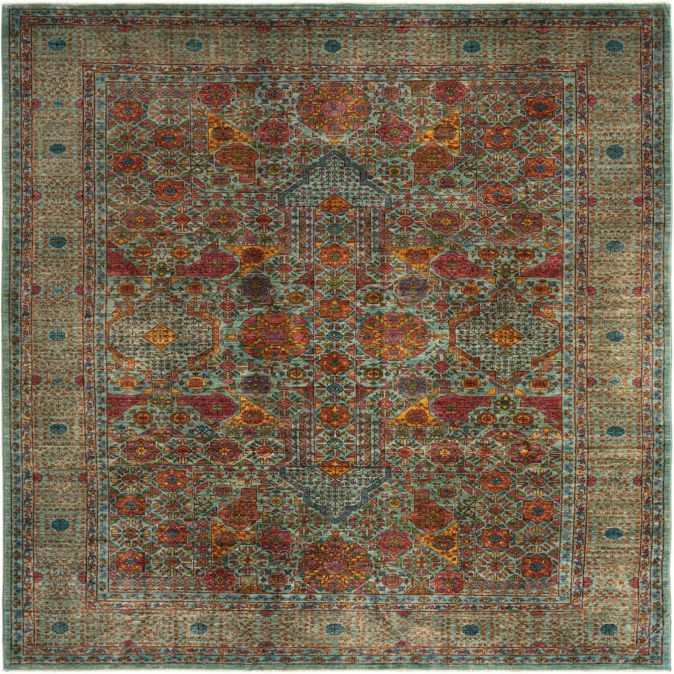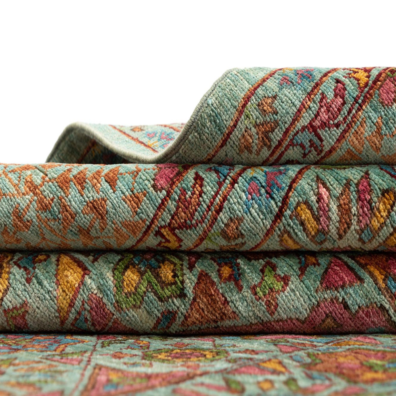 The Amina Collection offers a hand-made rug crafted from 100% wool, presenting durability and a sumptuous underfoot experience. This 7x10 rug is defined by its intricate pattern and a harmonious color palette, with the light blue background graciously supporting accent shades of pink, brown, yellow, red, green, and dark blue.