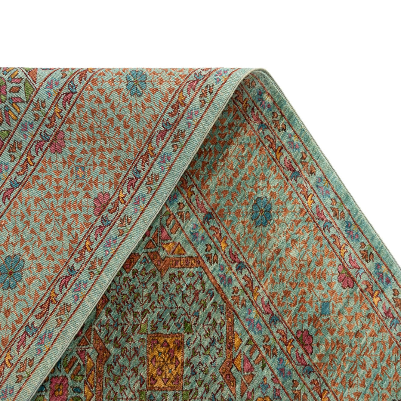 Its design features a central medallion surrounded by geometric motifs and a border that encapsulates traditional aesthetics. The rug’s medium pile adds a touch of texture that enhances its visual depth, while the wool construction ensures a soft, inviting surface.