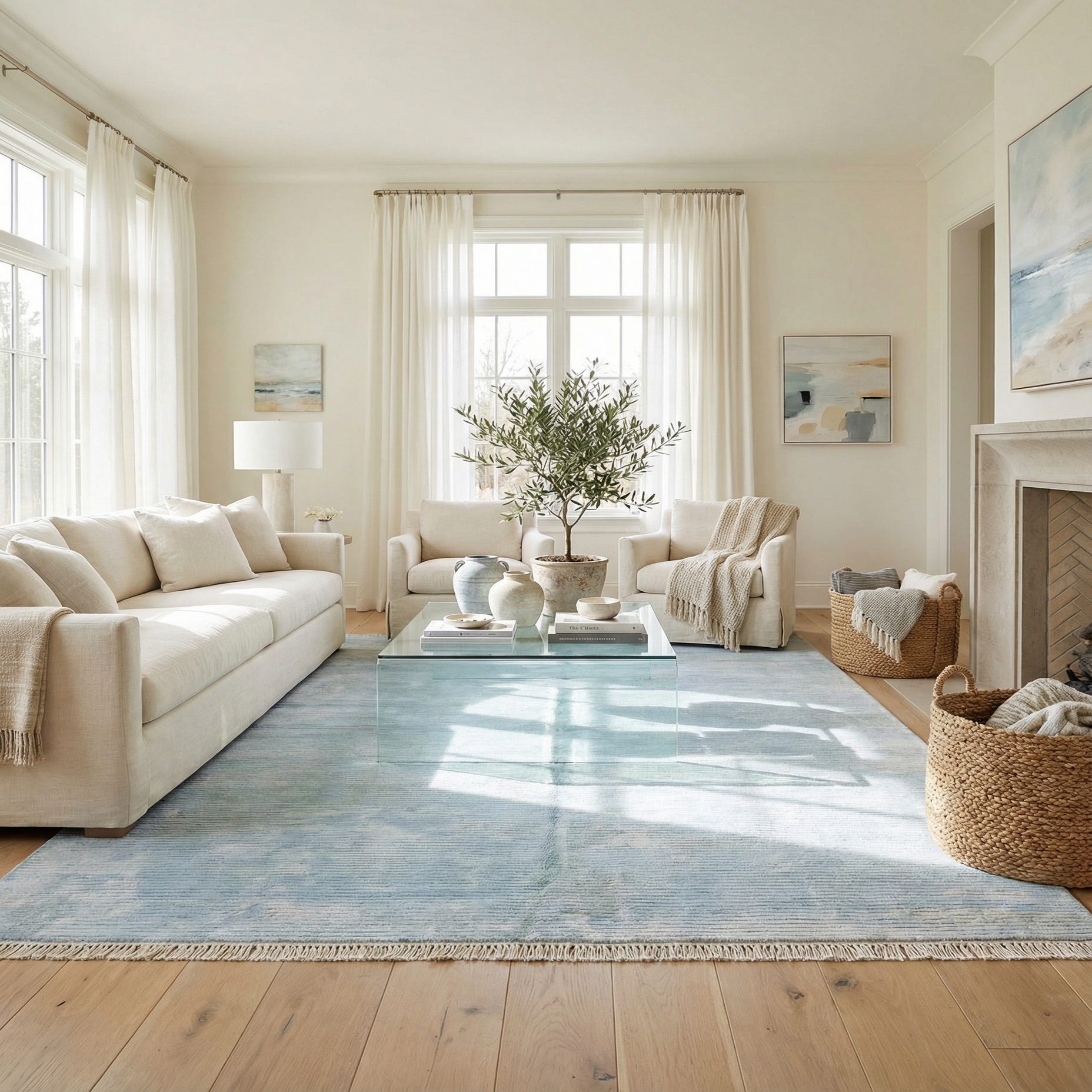 The soft woolen texture of this rug creates a comfortable surface underfoot and the hand-knotted construction ensures each piece is unique. The serene hue of light blue can act as a neutral base in various interior design styles, harmonizing with minimalist, coastal, or contemporary décor while also capable of softening more eclectic or industrial environments.