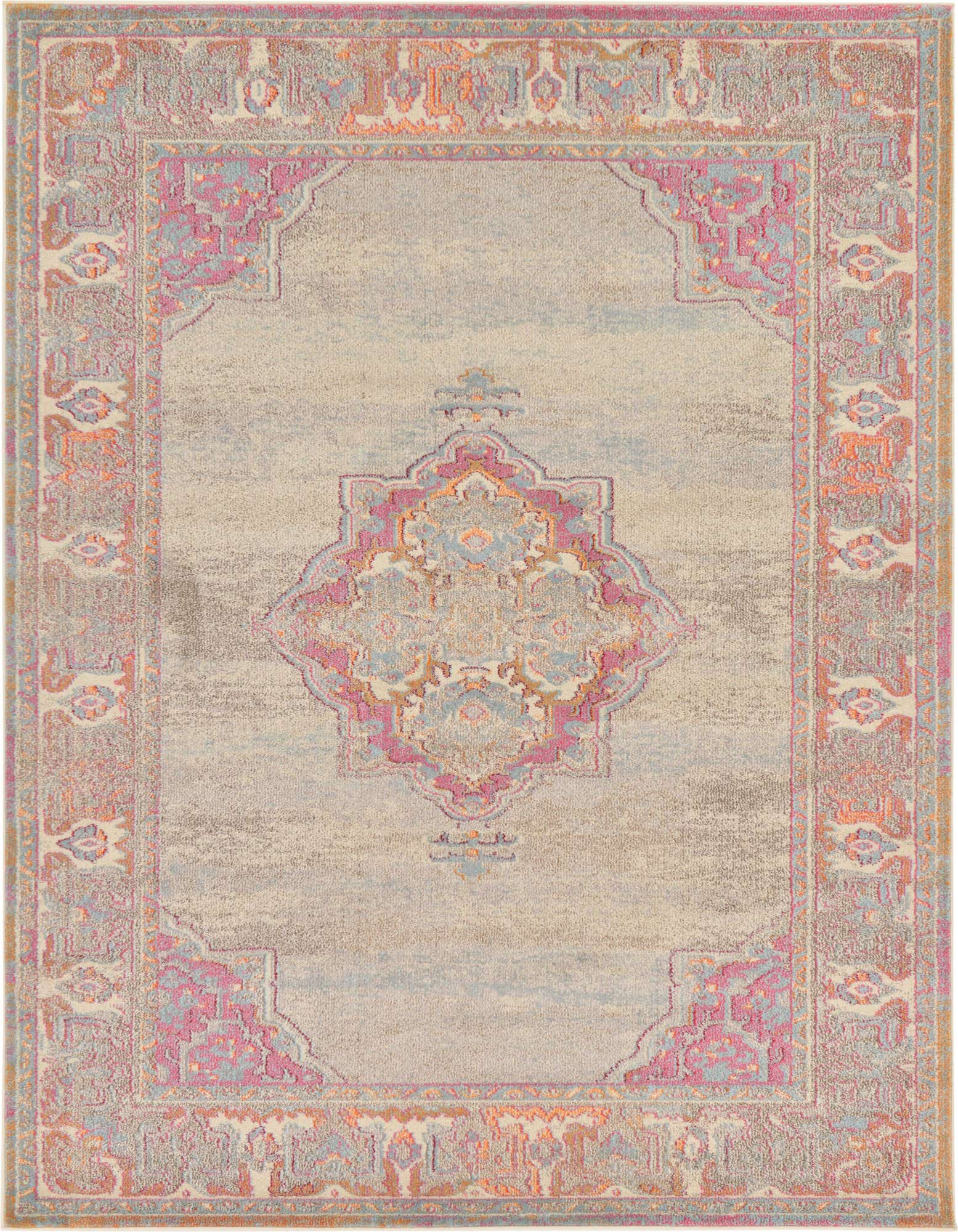 Primary color is Light Blue. Colors in this rug include: Light Blue, Beige, Brown, Gray, Light Green, Orange, Puce, Red, Pink.