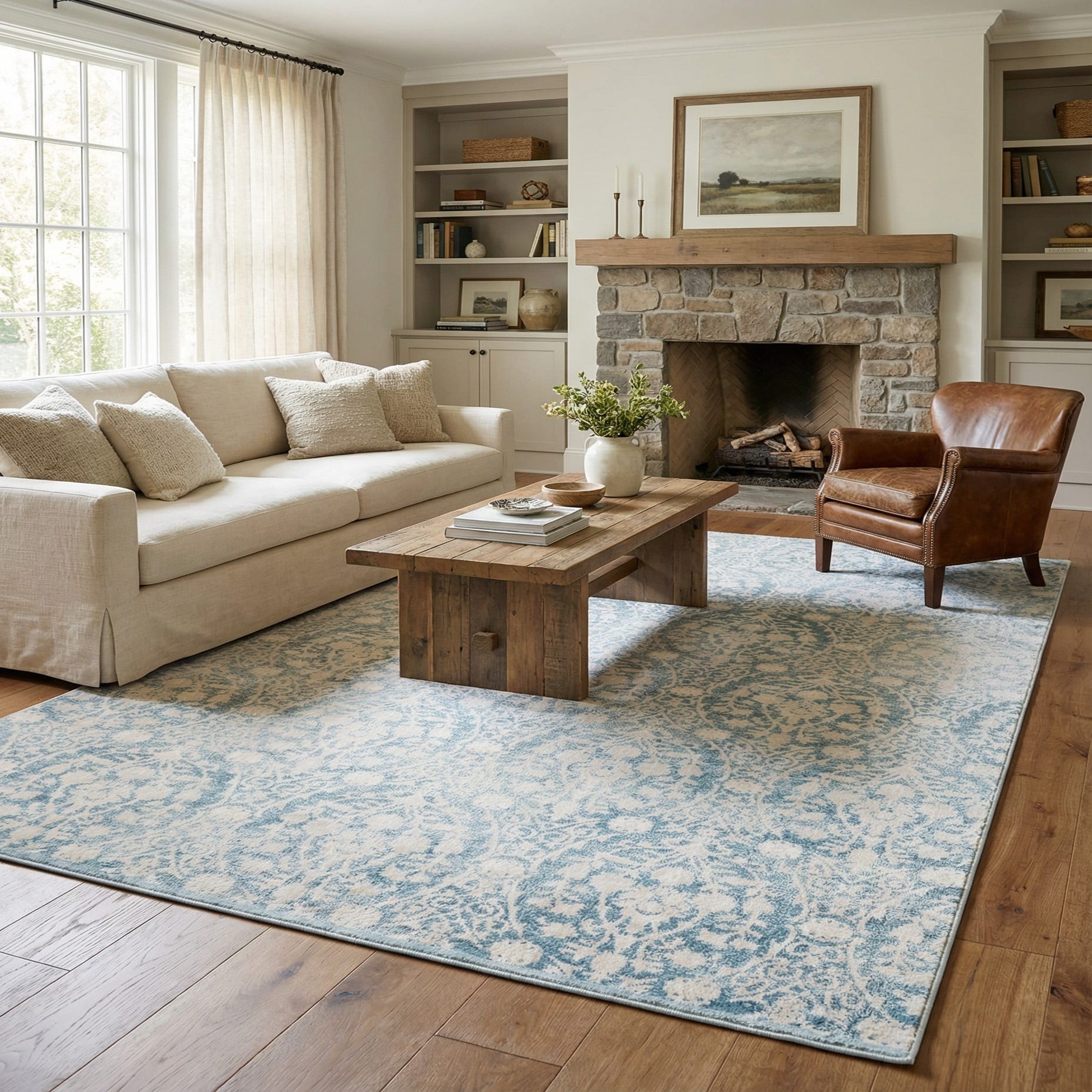 This rug works well in calm, airy interiors—pair it with light-wood furniture and linen or cotton upholstery for a coastal or relaxed transitional look, or use it to soften a more formal living room with neutral upholstery and simple metallic accents. It also makes a soothing foundation for a bedroom or a seating area, where the pale blue and ivory palette helps create a restful, coordinated space.