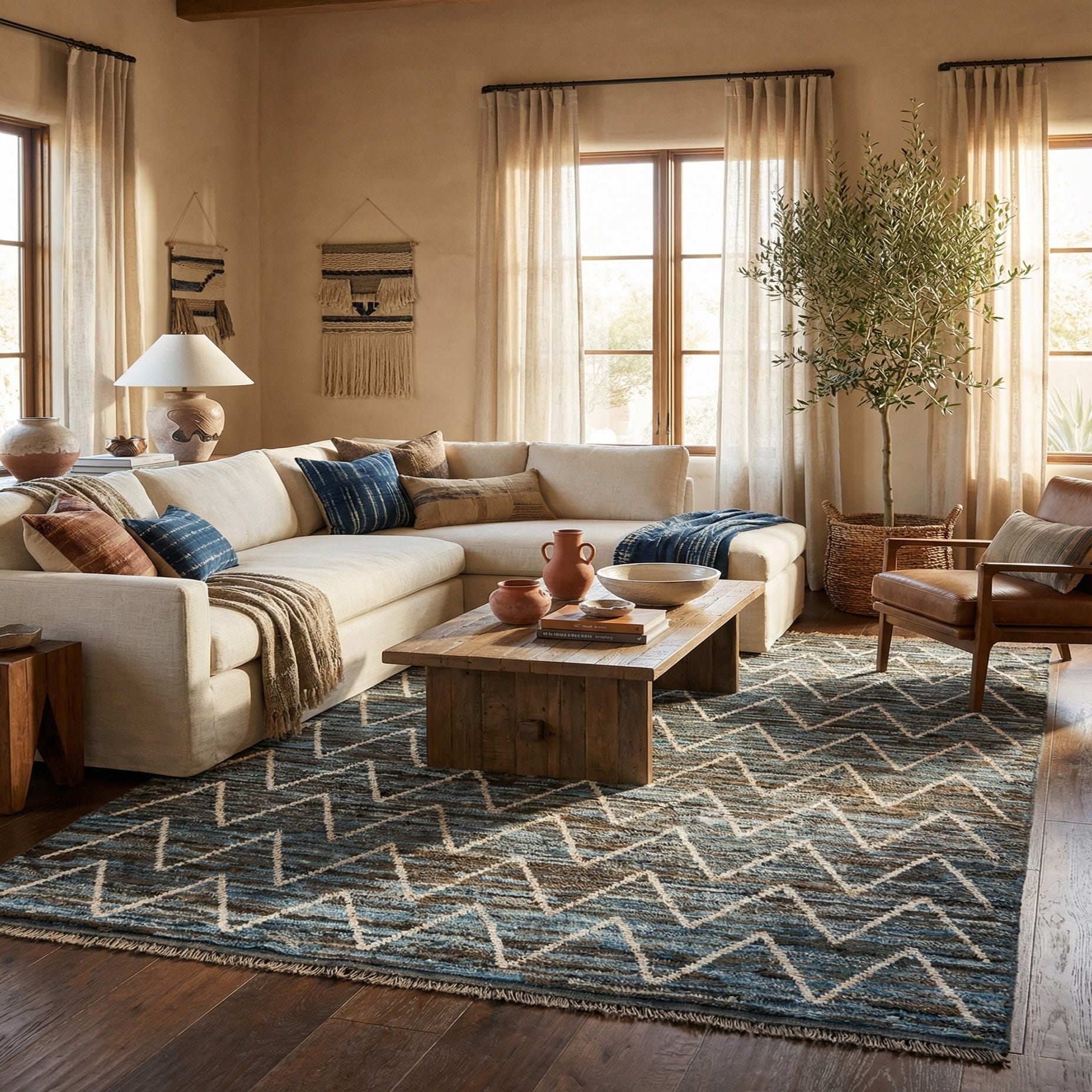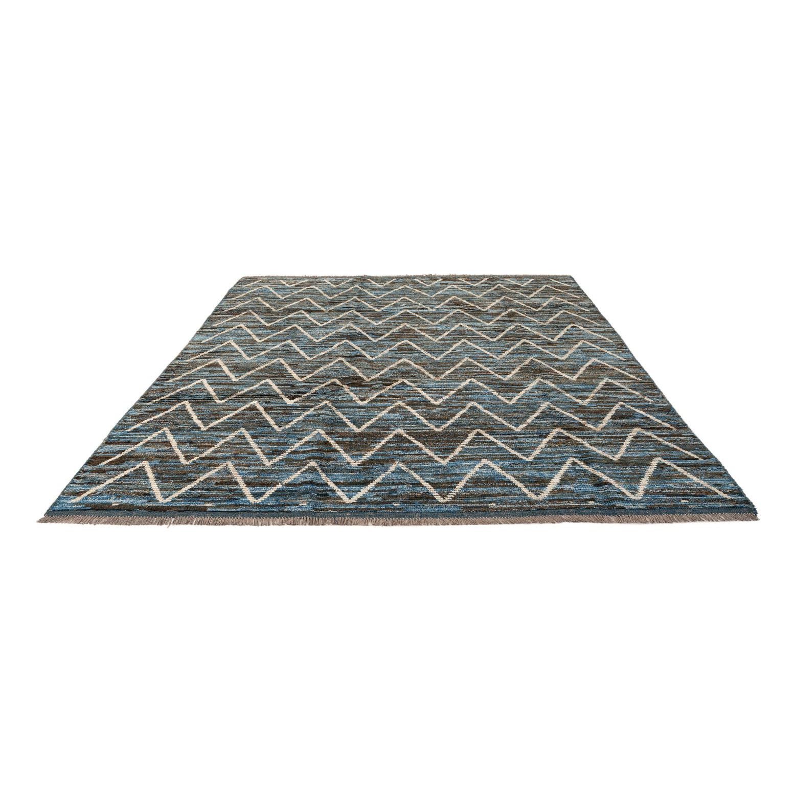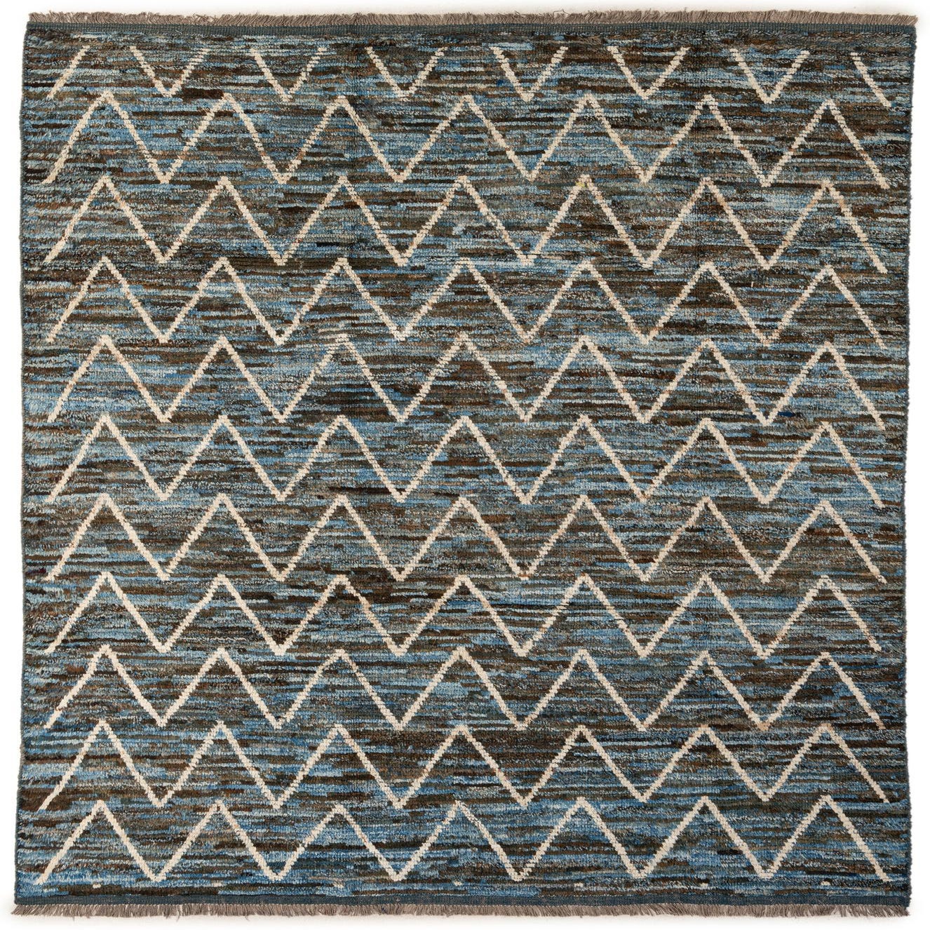 A 7x10 rectangular Moroccan wool rug featuring a repeating light blue and brown chevron pattern on a textured background.