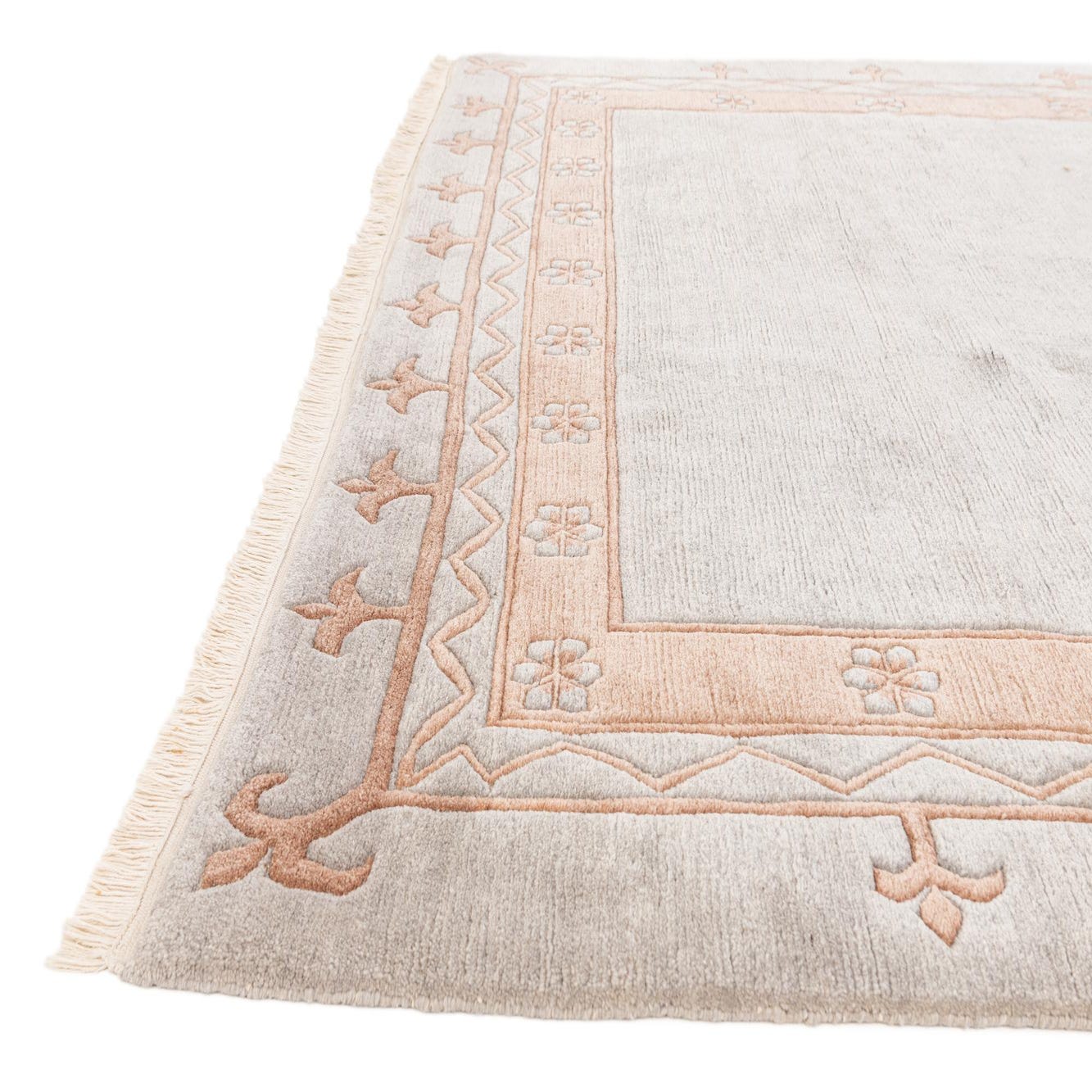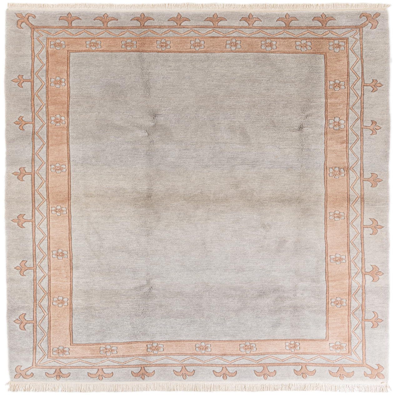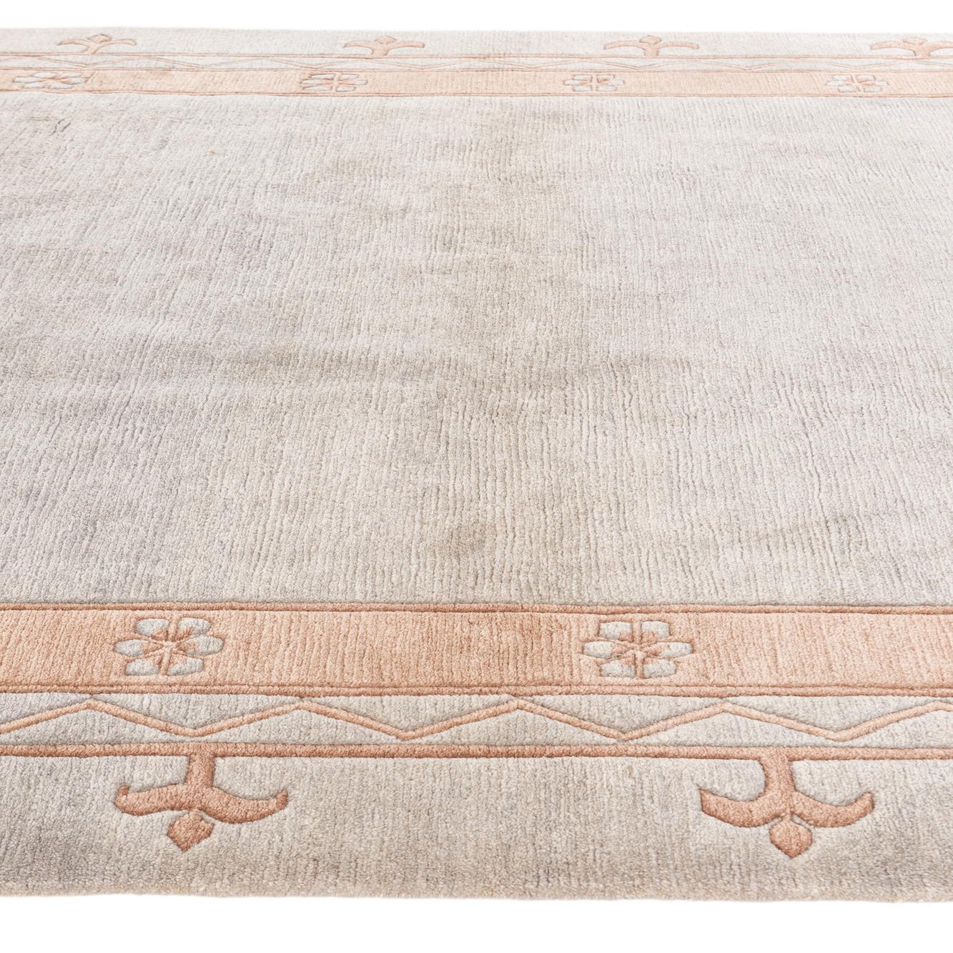 A 7x10 rectangular light blue wool area rug with a peach-colored modern floral and geometric border, suitable for a living room.