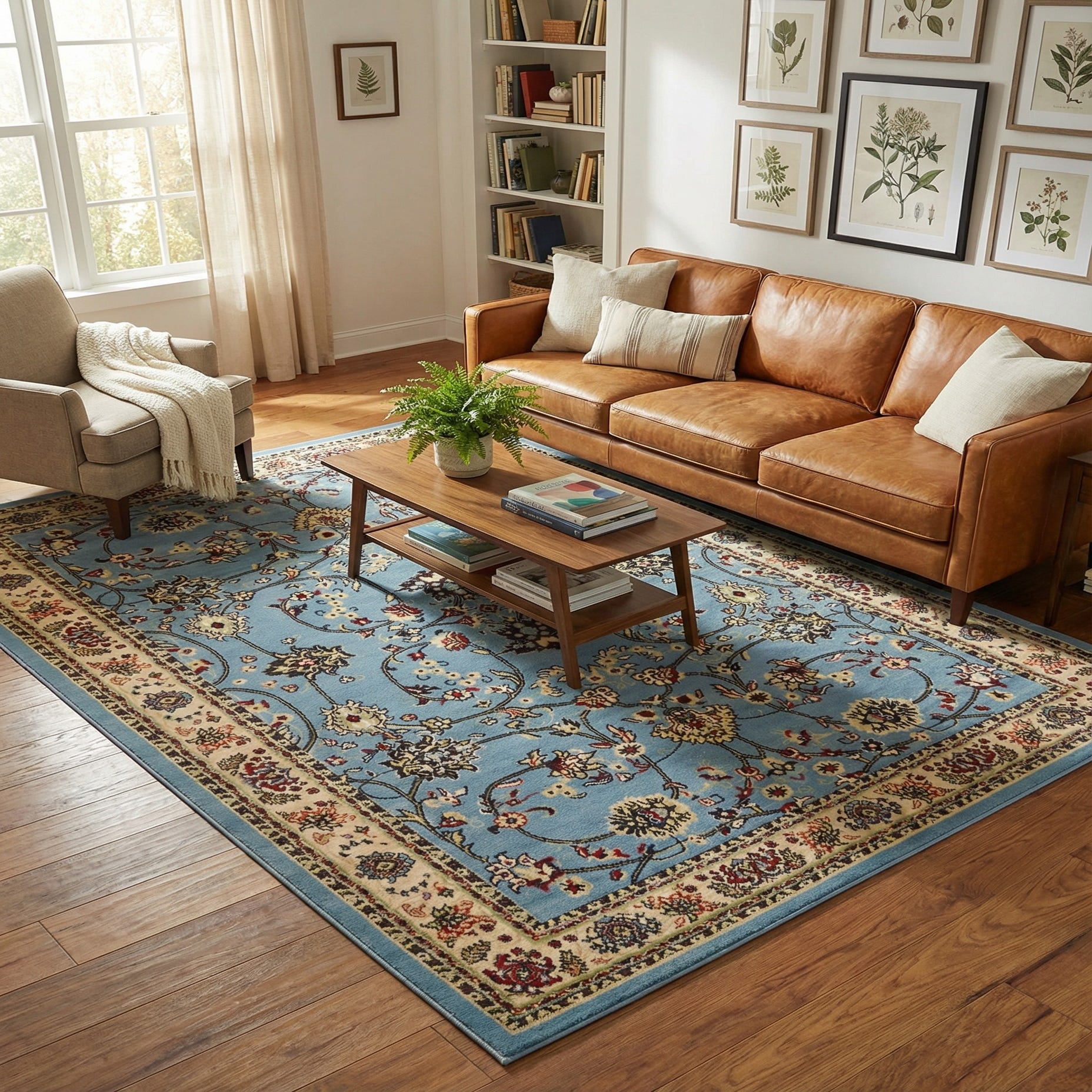 A traditional Persian-inspired floral layout unfolds across a light blue field, with scrolling vines and stylized blossoms arranged around a central, symmetrical motif and framed by a cream floral border. Accents of hunter green, rust red and navy blue punctuate the design, giving the pattern depth and a layered look. Machine-made from 100% polypropylene, the rug has a low-profile pile that feels smooth underfoot with a slight, refined sheen; the tightly constructed surface holds the pattern crisply and responds well to everyday use.