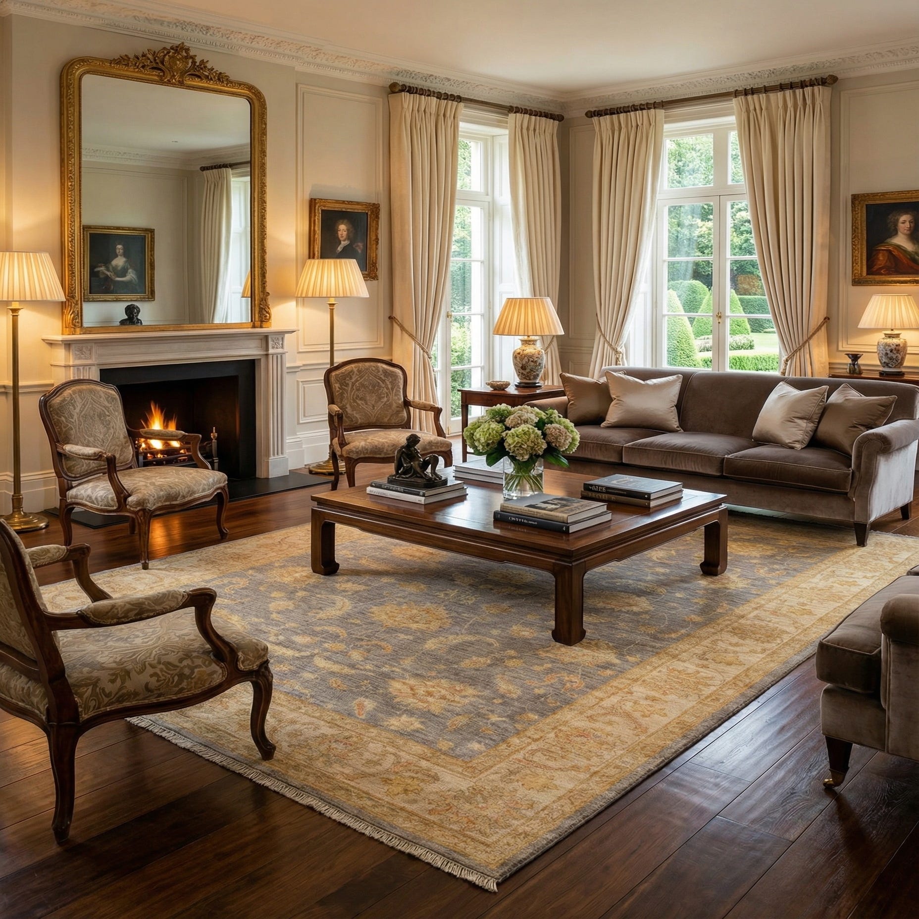 This piece works well as an anchor for a relaxed living room seating area, layered beneath a neutral sofa and natural wood pieces, or as a soothing addition at the foot of a bed in a light, airy bedroom. It also complements transitional or coastal schemes where soft blues and warm neutrals bring cohesion, and it pairs nicely with linen upholstery, muted metallic accents, and vintage-repurposed furniture for a collected, lived-in look.
