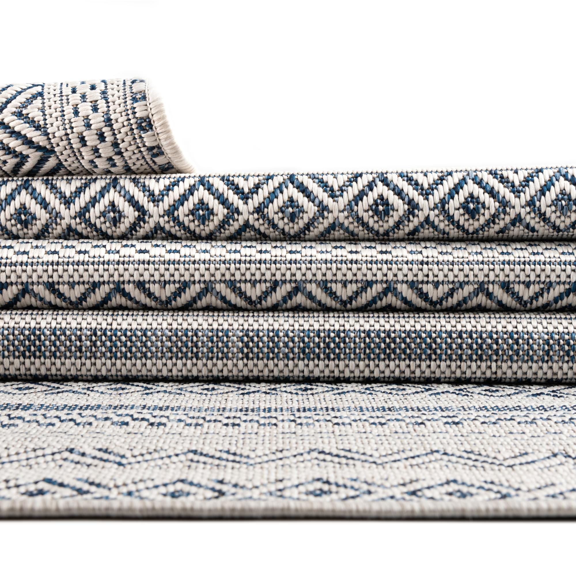 Place this rug on a covered patio or poolside lounge to define a seating group, or use it in a sunroom, breezy entryway, or over a deck to introduce pattern without overpowering the space. It pairs well with whitewashed woods, natural wicker and navy or neutral textiles, and the octagonal shape makes it an easy anchor for round tables, bistro sets or informal conversation areas.