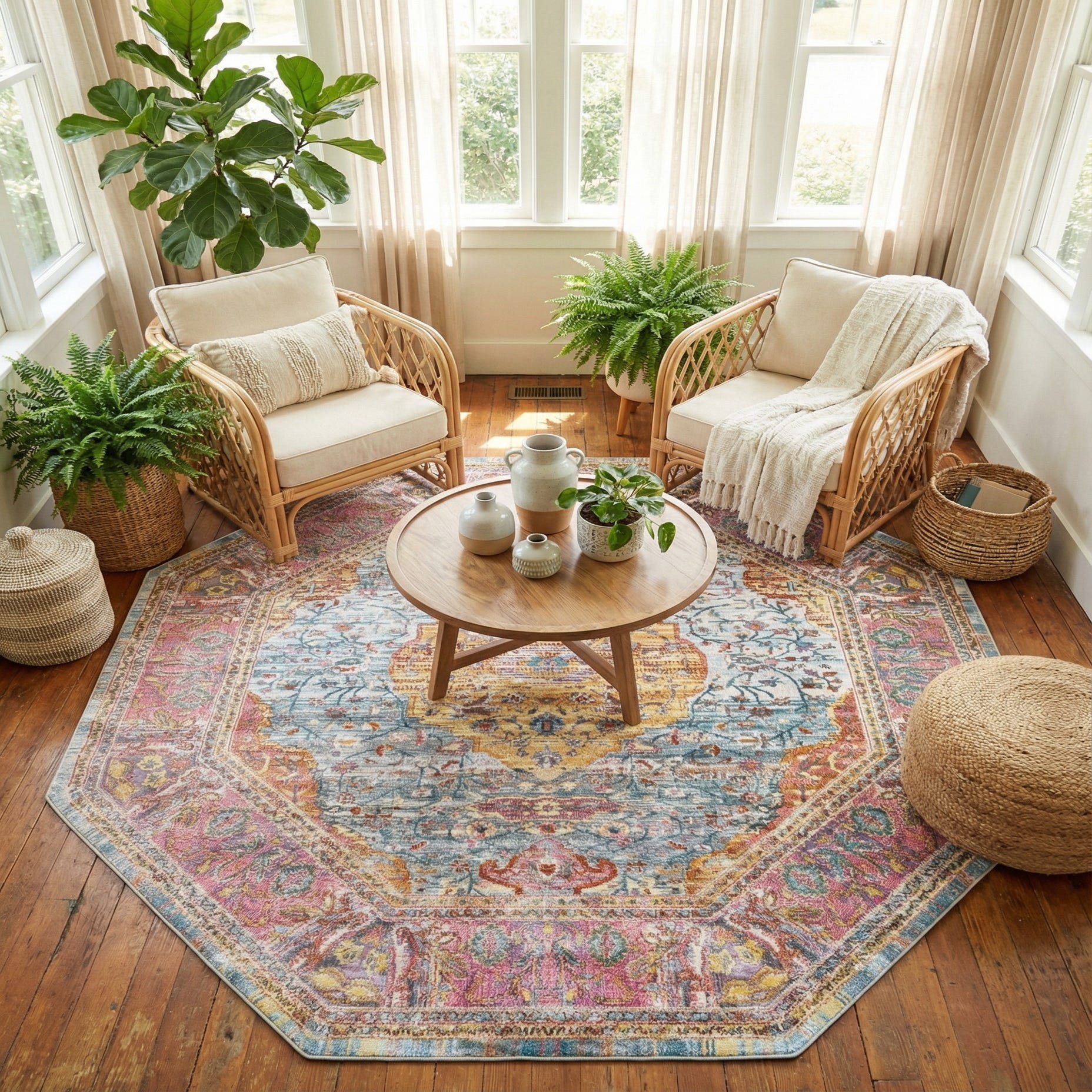 Use this rug to add a relaxed, collected look to a dining nook beneath an octagonal table, as a focal point in a seating area, or layered in a bright bedroom or sunroom. It pairs nicely with warm wood finishes and brass or antique-gold accents, linen upholstery in neutral tones, or eclectic mixes of patterned throw pillows for a bohemian-meets-traditional feel.