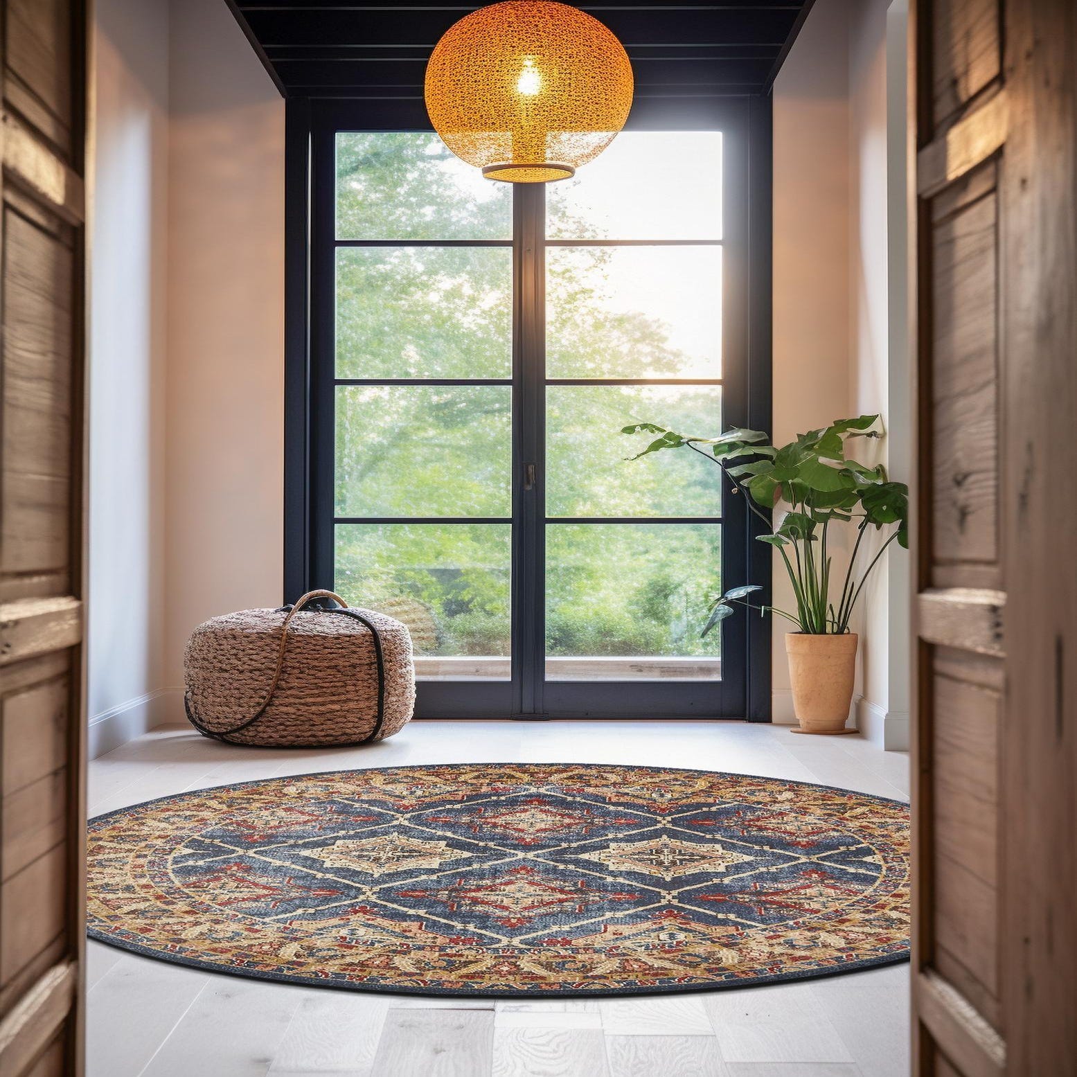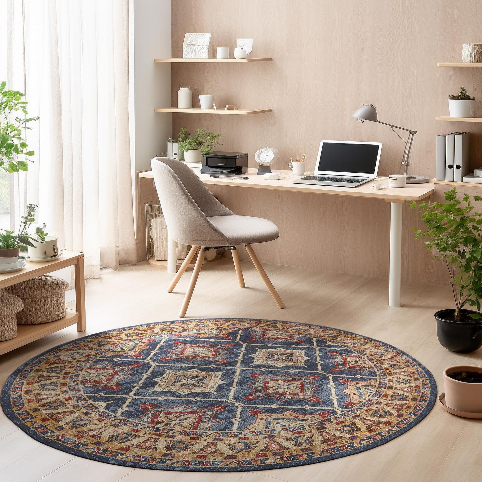 I bought this rug last month for my studio to add warmth and a finished look to the space. It does a great job and the design is beautiful! Since it’s not in my home I didn’t want to spend a ton on a super expensive rug but need an 8’ round. I was so pleased and the pricing selection and quality! Very durable rug. It’s a slight bit thinner than the more expensive version I have in my home but for the money I am truly happy. Fiber are soft on my feet and it seems very durable when I vacuum it. A+