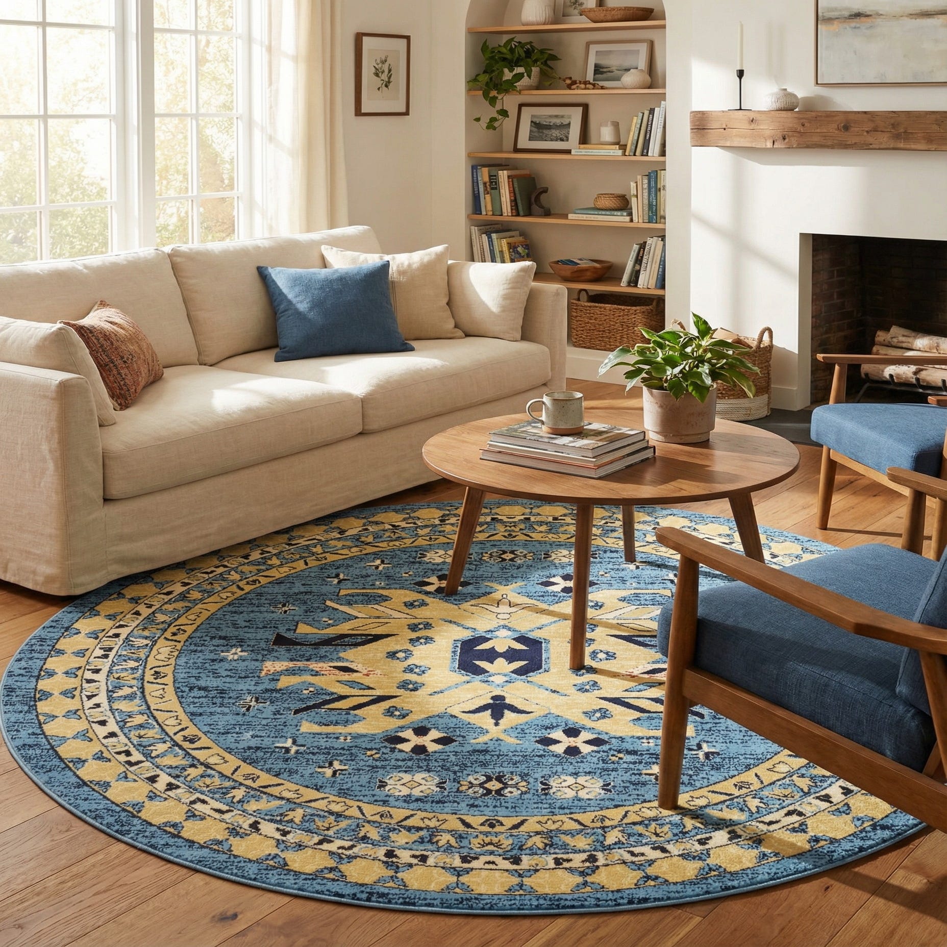 Use this rug to anchor a round dining set or to introduce color in an entry or conversation area. It complements warm wood tones and navy upholstery, pairs nicely with cream or natural linens, and adds a grounded focal point in transitional, coastal, or global-inspired interiors. The palette and pattern work equally well layered under a coffee table or centered beneath a bed to bring a calm, collected look to the room.