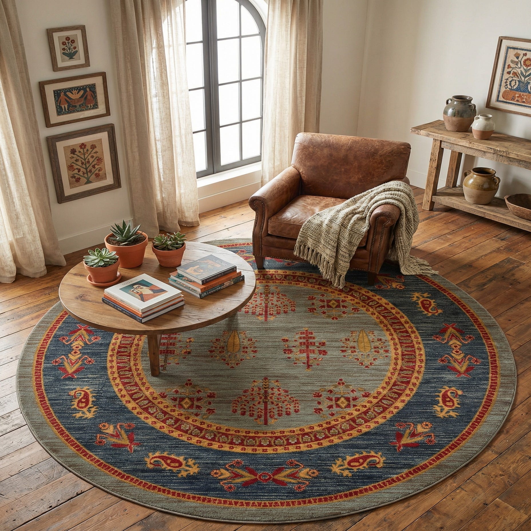 This rug can be seamlessly integrated into living rooms with transitional or contemporary decor. It can also provide a refreshing pop of color in minimalist spaces or serve as an anchor piece in eclectic rooms that mix various design periods and styles. The 8 Ft Round dimension offers a focal point for seating arrangements and can add warmth to spacious environments or define areas within an open-plan layout.