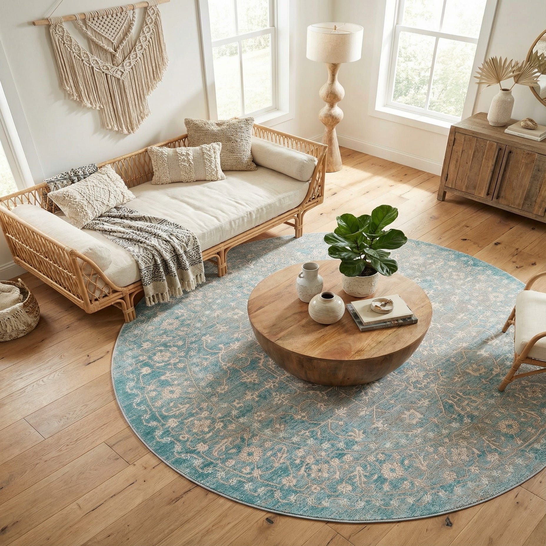 This 8-foot round rug from the Modern Classical collection offers a harmonious blend of contemporary and traditional styles. Machine woven with a durable mix of 70% polypropylene and 30% polyester, the rug presents a light blue background adorned with a sophisticated ivory pattern. Its intricate design echoes classical motifs, bringing a sense of history to its modern construction.