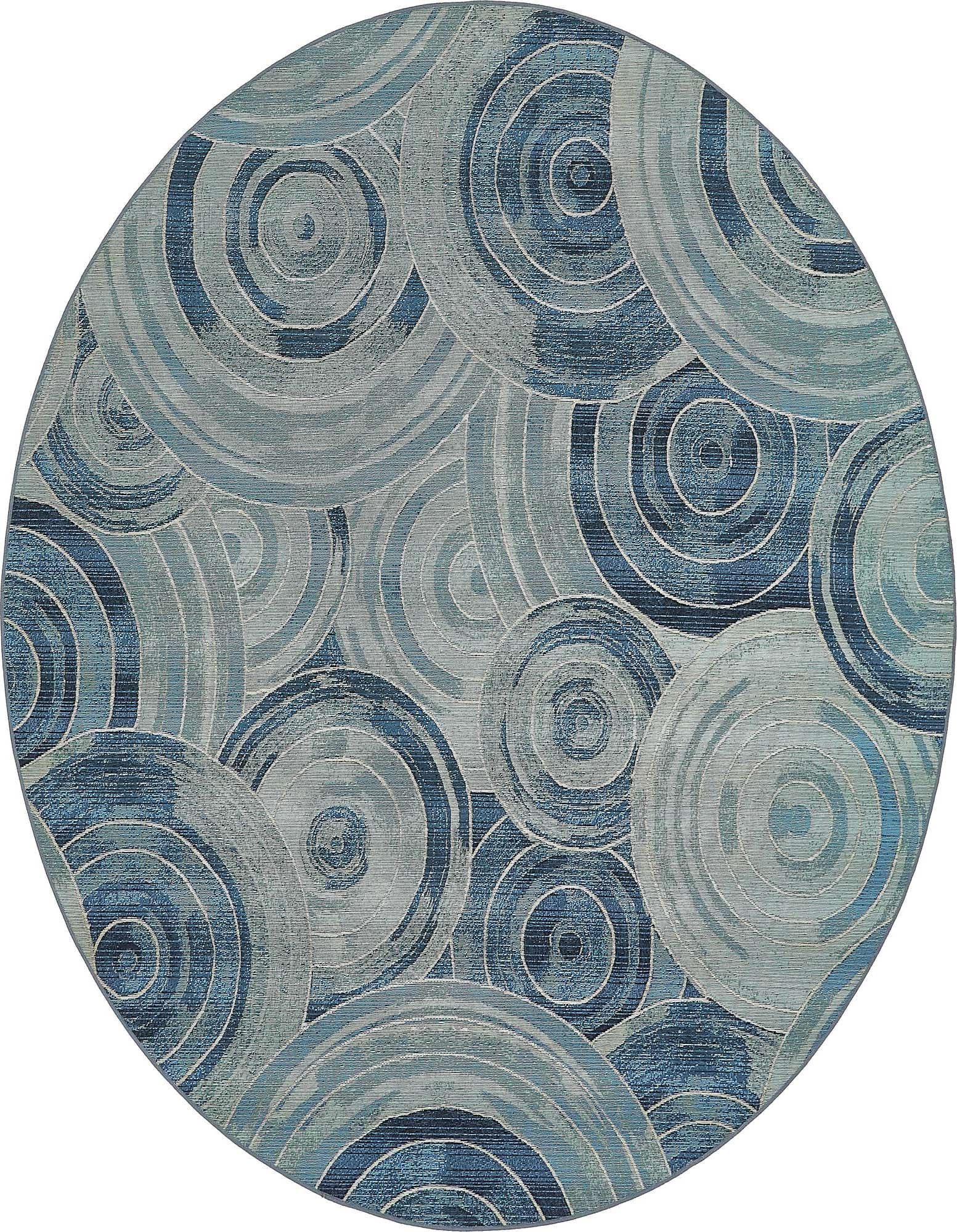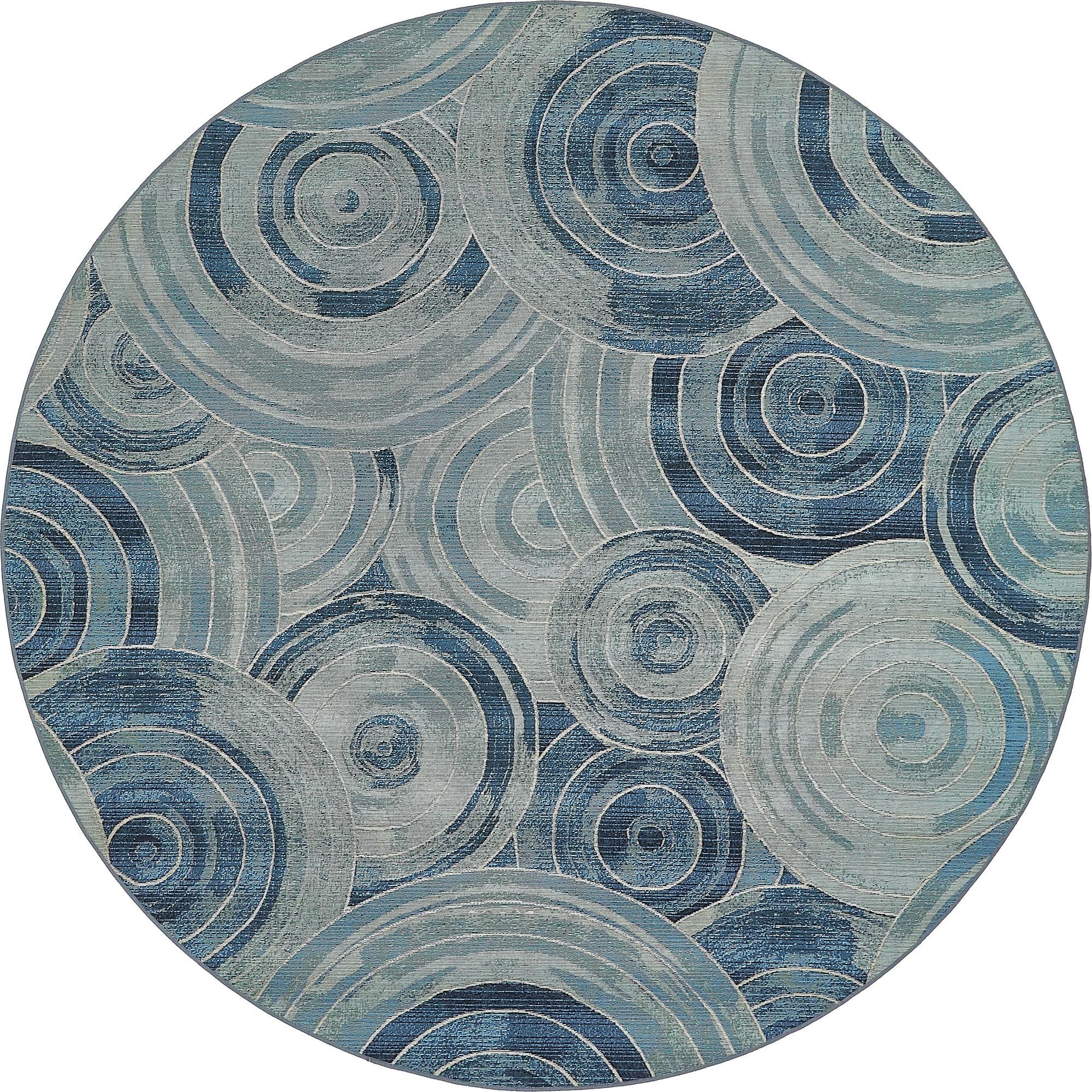 A layered composition of overlapping concentric rings gives this round rug a modern, graphic look. The background is a soft light blue, with bands of blue and navy blue forming textured circular motifs that alternate between smooth and subtly ribbed surfaces. Machine-made from 100% polypropylene, the weave has a low-profile, slightly nubby hand that adds gentle dimension underfoot and a restrained sheen that highlights the circular pattern without overpowering the palette.
