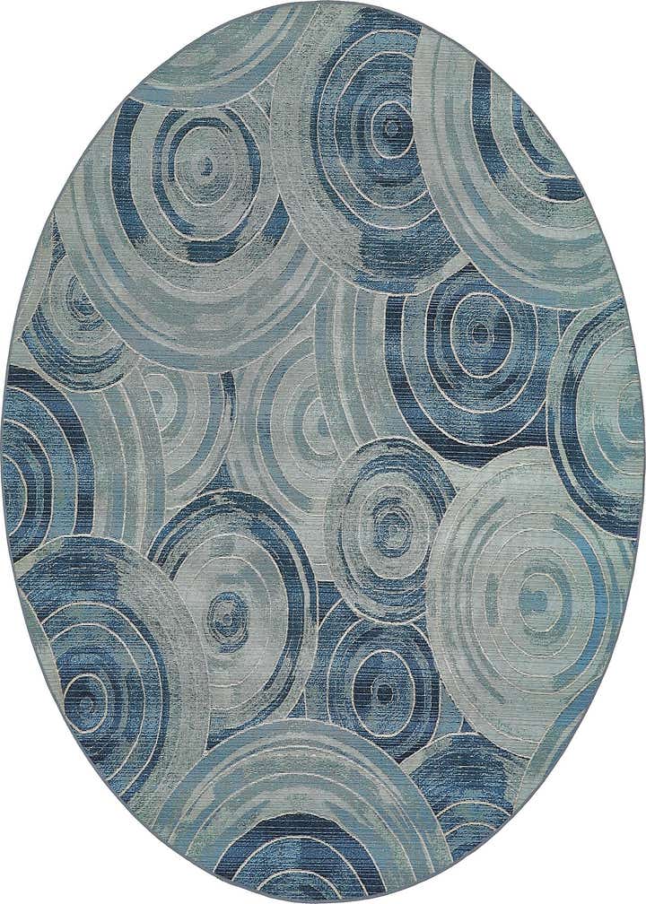 Place this rug under a round dining table or at the center of a conversation area to anchor seating with a cool, coastal-inspired color story. It also works well on a covered patio or sunroom, paired with natural wicker, warm wood tones, and crisp white accents, or in a contemporary living room where layered blues and geometric shapes carry the scheme.