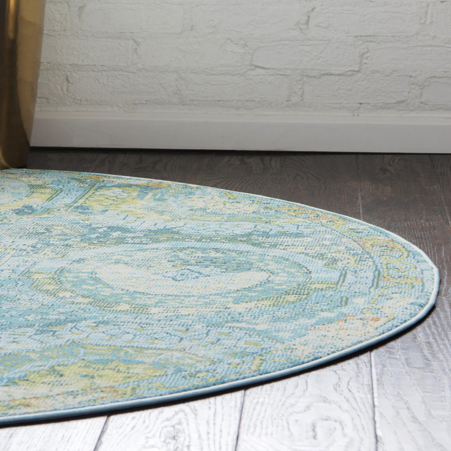 Machine made from 100% polypropylene, the rug has a low, smooth pile with a subtly textured hand that feels comfortable underfoot while maintaining clear pattern definition. It works well beneath a round dining table, as an anchor for a cozy seating grouping, or layered at the foot of a bed. Pair it with natural wood furniture, linen or cotton upholstery, woven baskets and brass or aged metal accents for a coastal, cottage or relaxed transitional interior where the soft blues and greens can set a tranquil tone.