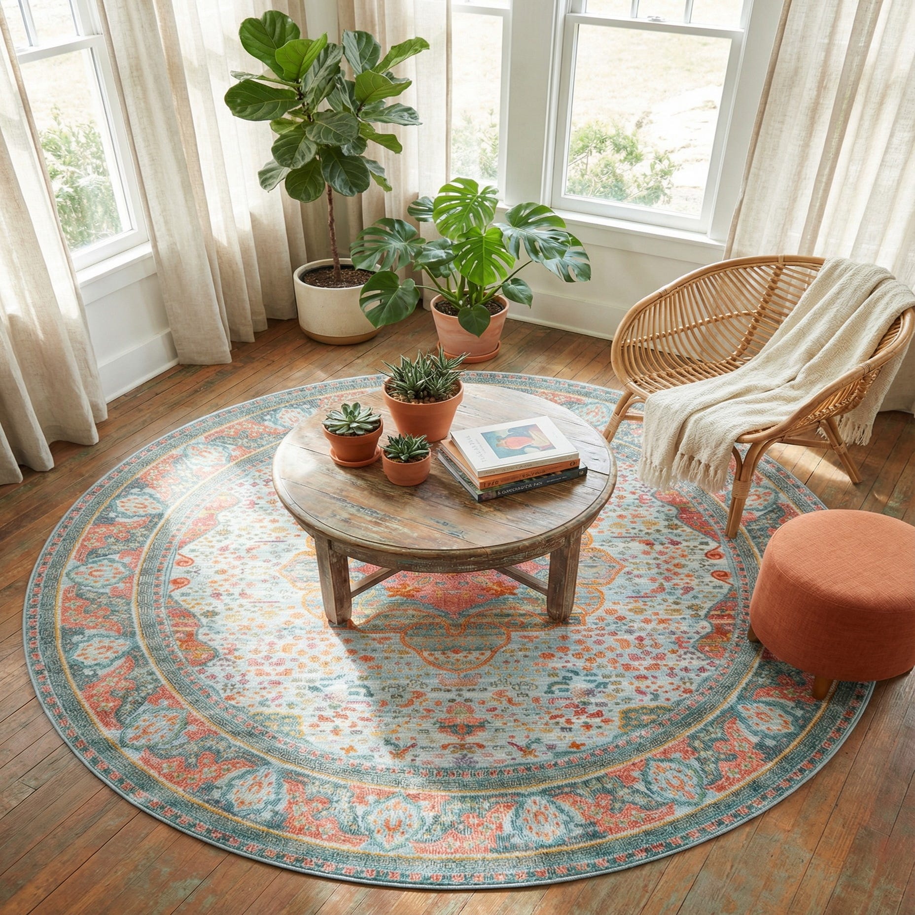 This rug fits well in relaxed coastal or cottage interiors where its light blue ground and coral highlights complement whitewashed wood and woven textures. It also pairs nicely with transitional or bohemian schemes—place it under a round dining table or to anchor a cozy seating area with linen upholstery and natural fiber accents. The durable polypropylene construction makes it a good choice for living rooms, family rooms, or entryways that benefit from a colorful yet understated focal point.