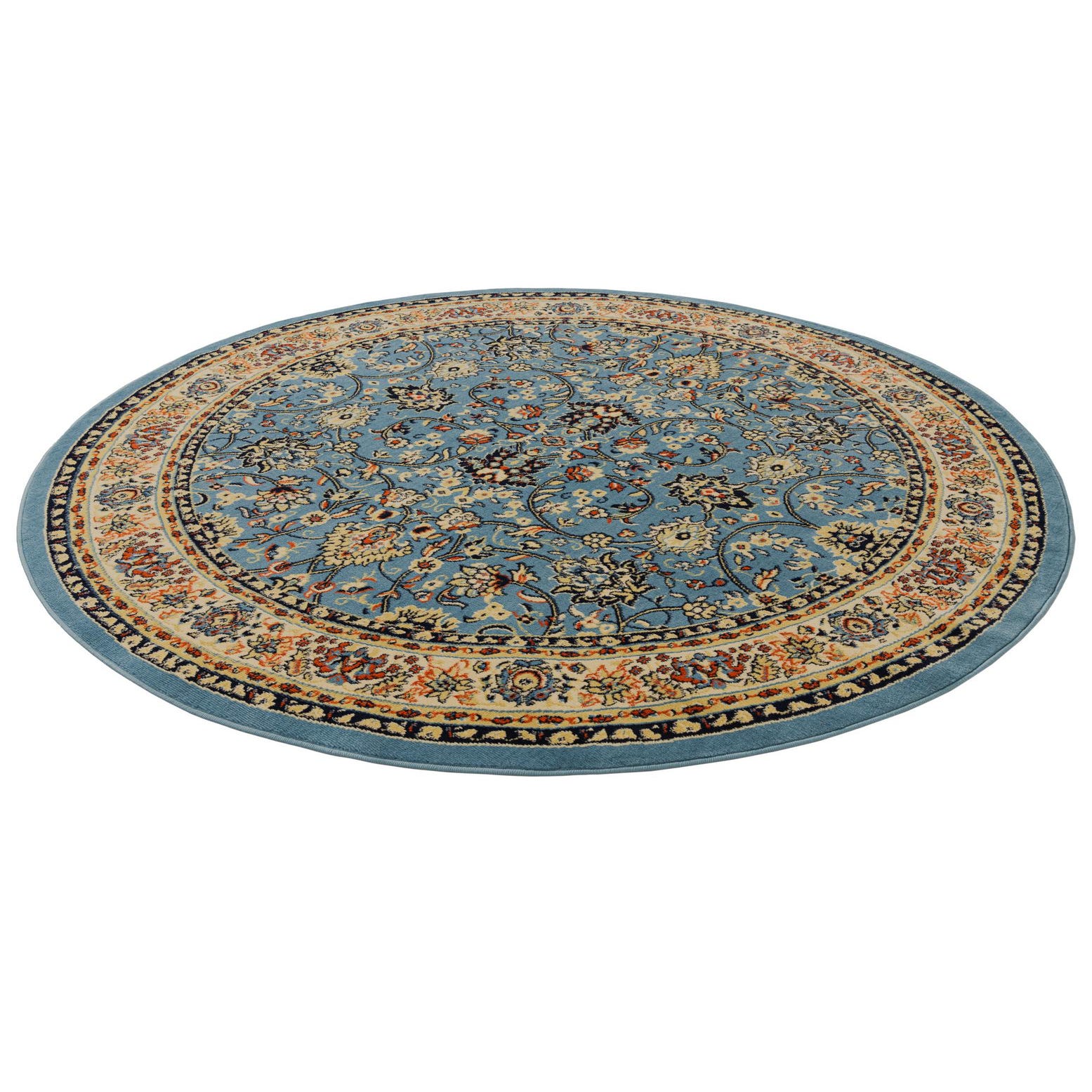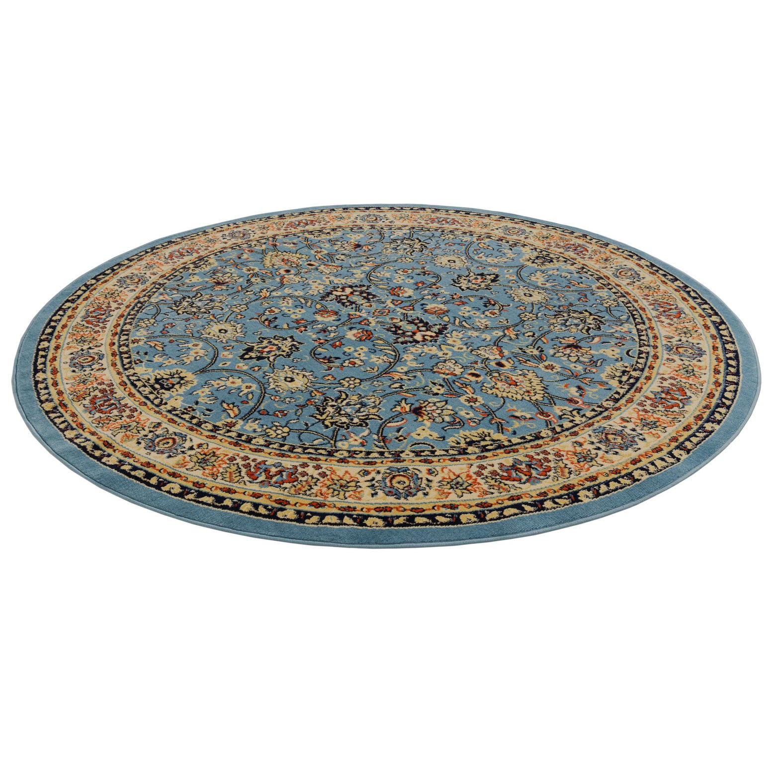 A classic floral medallion pattern fills a soft, light blue field, where looping vines and palmette motifs create a balanced, symmetrical layout. Cream and navy form the stacked borders that frame the center, while rust red and hunter green accents punctuate the design for visual warmth and contrast. The navy outlines sharpen each motif against the light blue background, giving the rug a clear, finished look that bridges traditional and transitional styles.