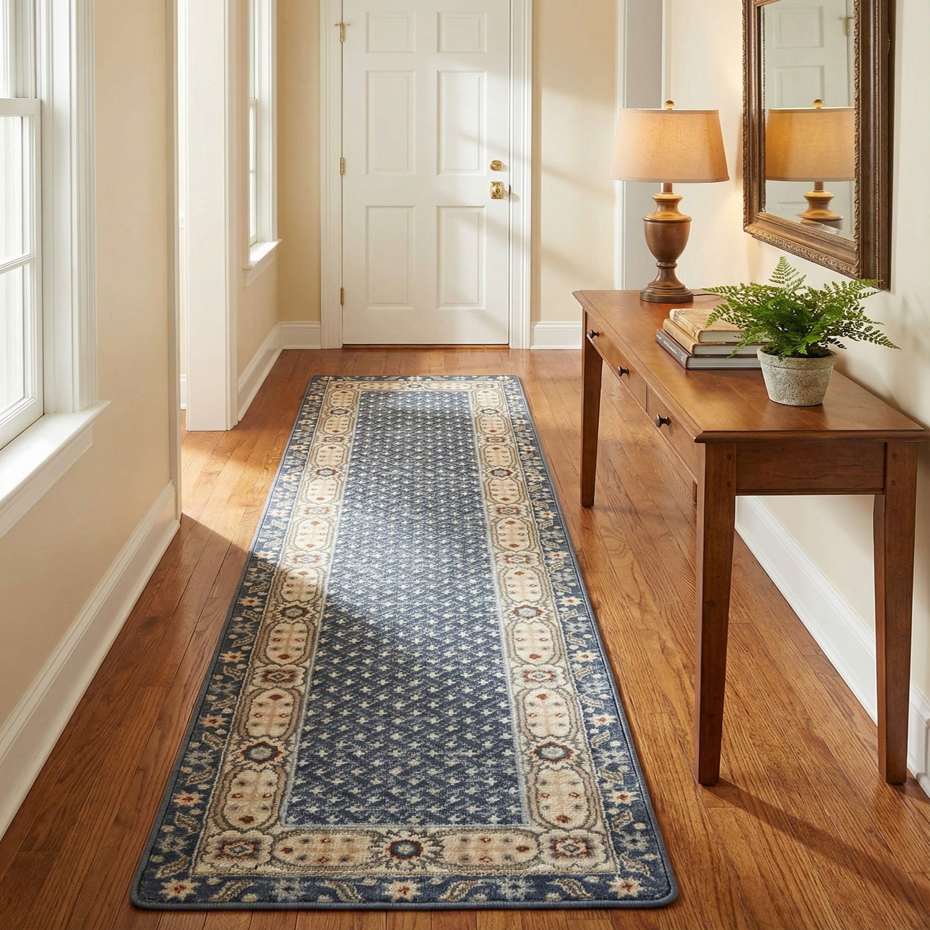 Primary color is Light Blue. Colors in this rug include: Light Blue, Gray, Ivory, Rust Red.