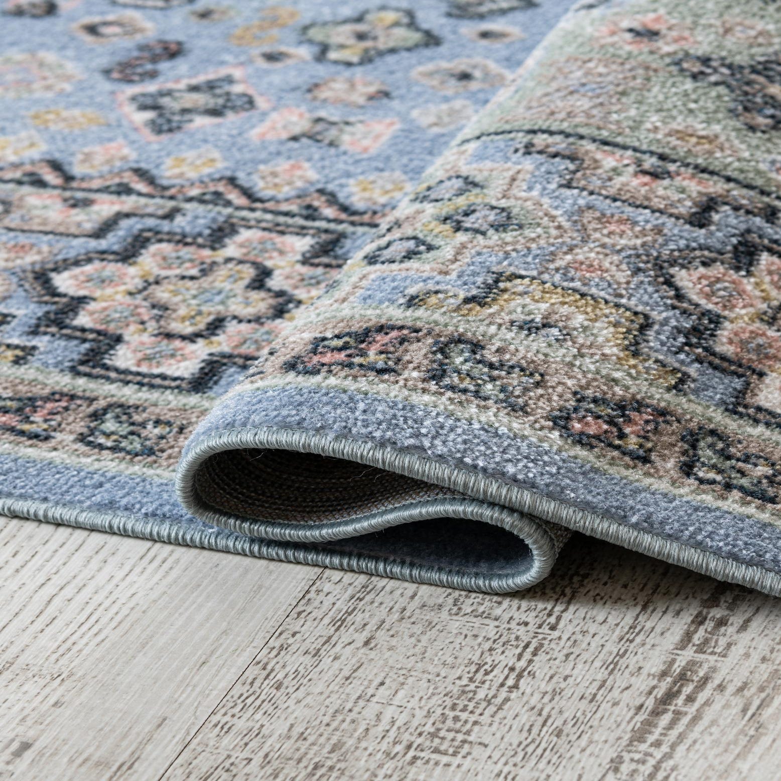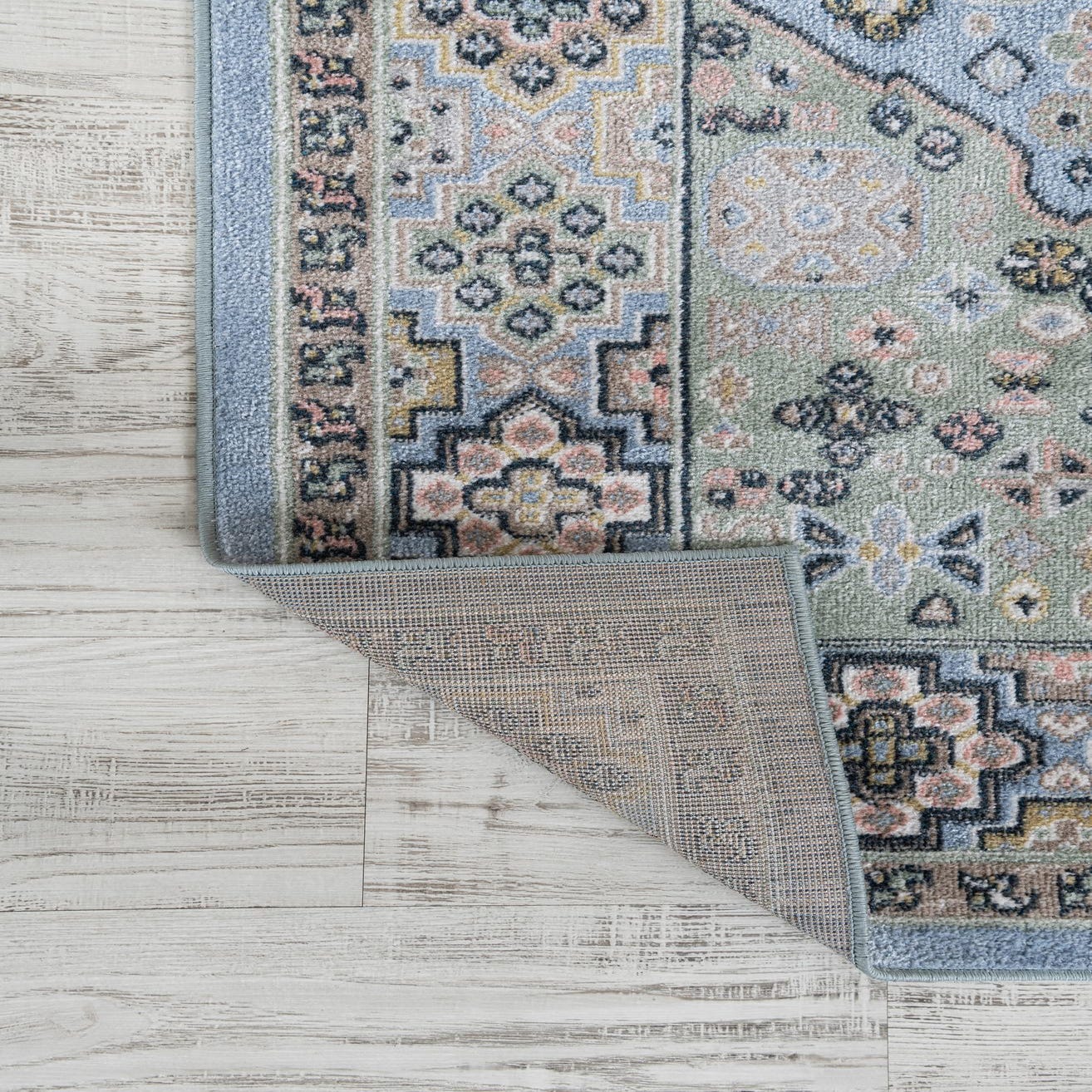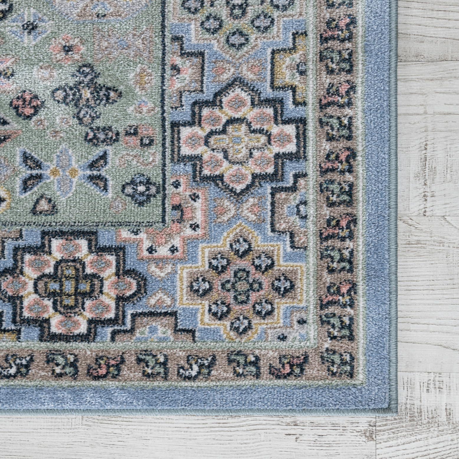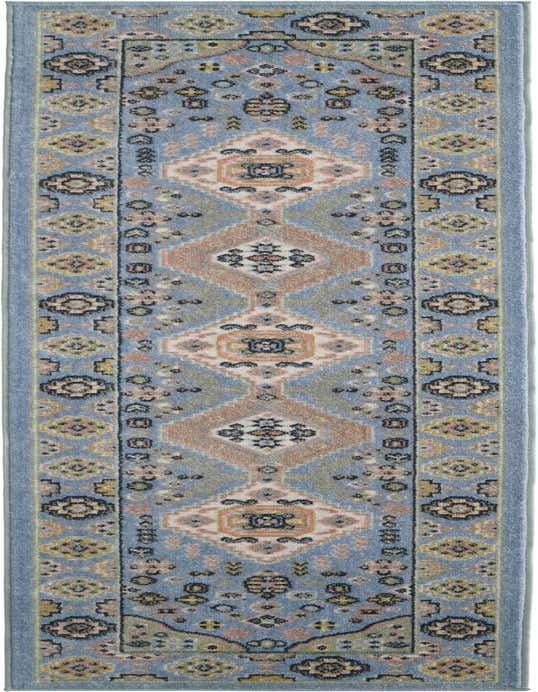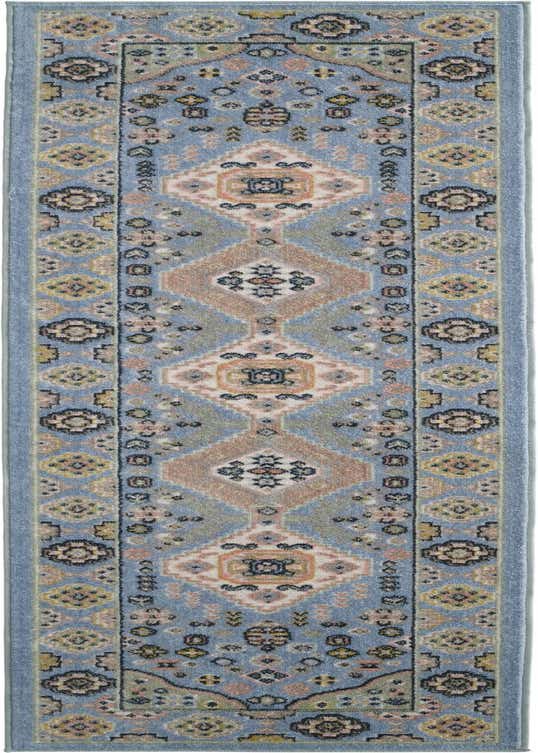 Primary color is Light Blue. Colors in this rug include: Light Blue, Beige, Black, Ivory, Pink, Gray, Green.