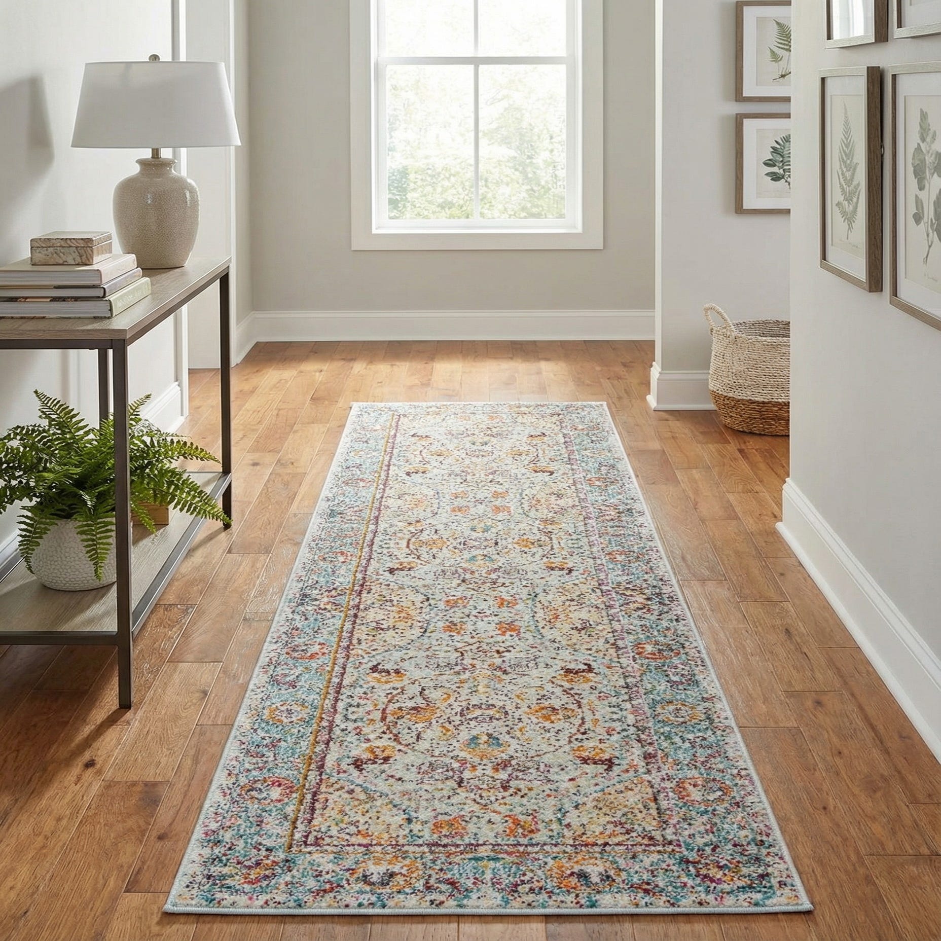 Use this runner to anchor a hallway or entry, run it along a kitchen aisle, or place it beside a bed to introduce color and pattern without overwhelming the room. It works well with whitewashed or light wood floors, mid-century modern furniture, or layered boho interiors. Pair with neutral upholstery to let the rug’s colors carry the space, or echo the gold and purple accents in pillows and artwork for a coordinated, intentional look.