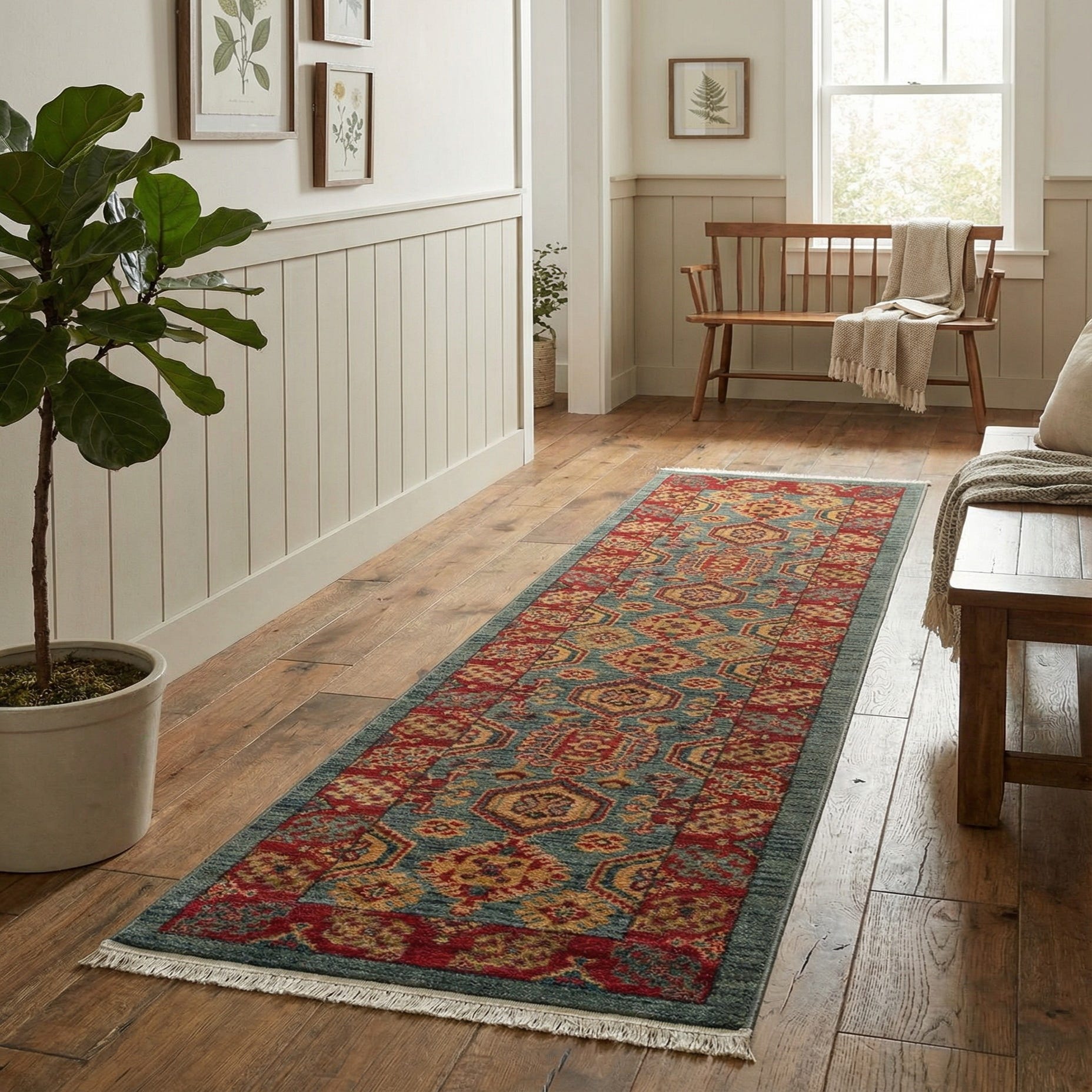 Designed for hallways, entryways or narrow spaces beside kitchen islands, the color combination brings both warmth and freshness to a room. Pair it with warm wood tones and leather or brass accents for a traditional look, layer it over a neutral natural-fiber rug for a relaxed farmhouse or cottage vibe, or use it to add color and pattern to a transitional or eclectic scheme with solid upholstery and textured throws.