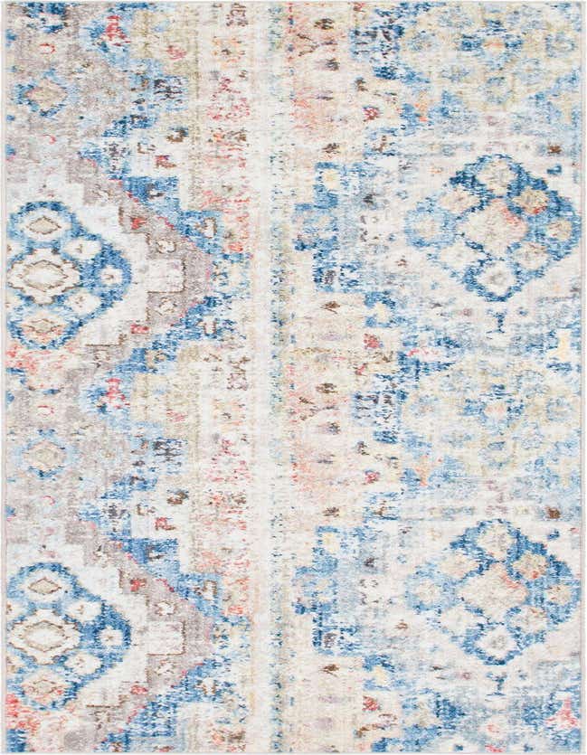 Primary color is Light Blue. Colors in this rug include: Light Blue, Beige, Blue, Brown, Gold, Gray, Ivory, Navy Blue, Orange, Red, Violet.