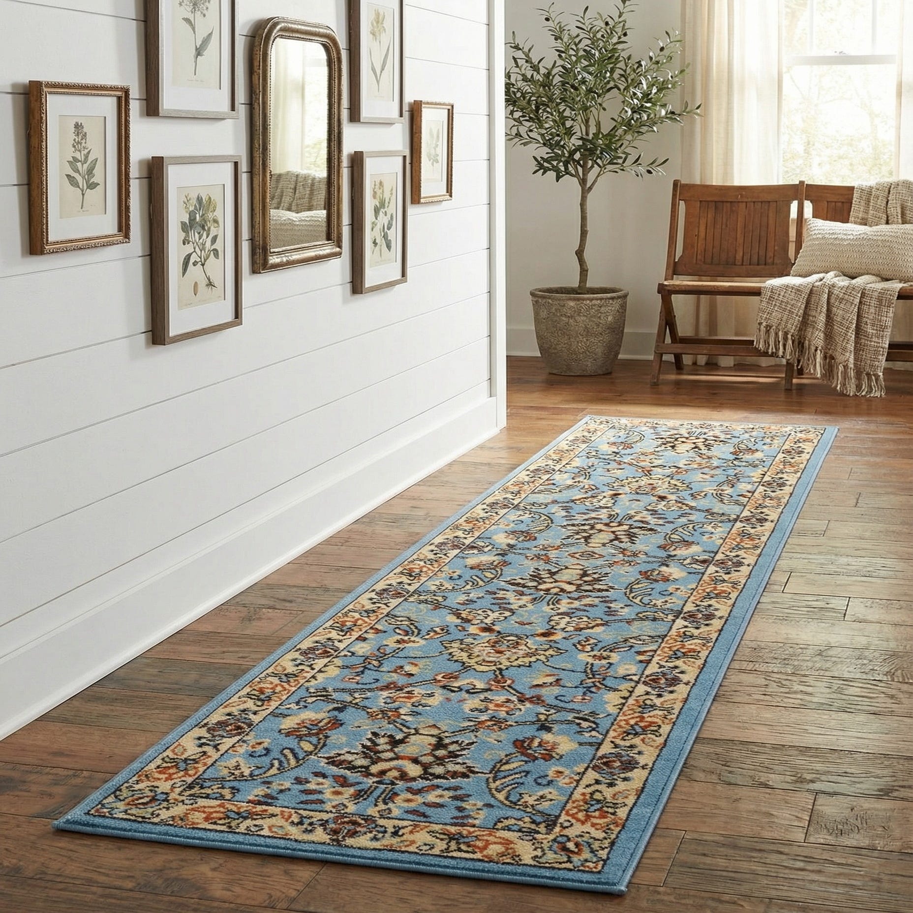 A light blue 8 ft runner rug with a traditional oriental floral pattern in cream, red, and black, ideal for a hallway or kitchen.