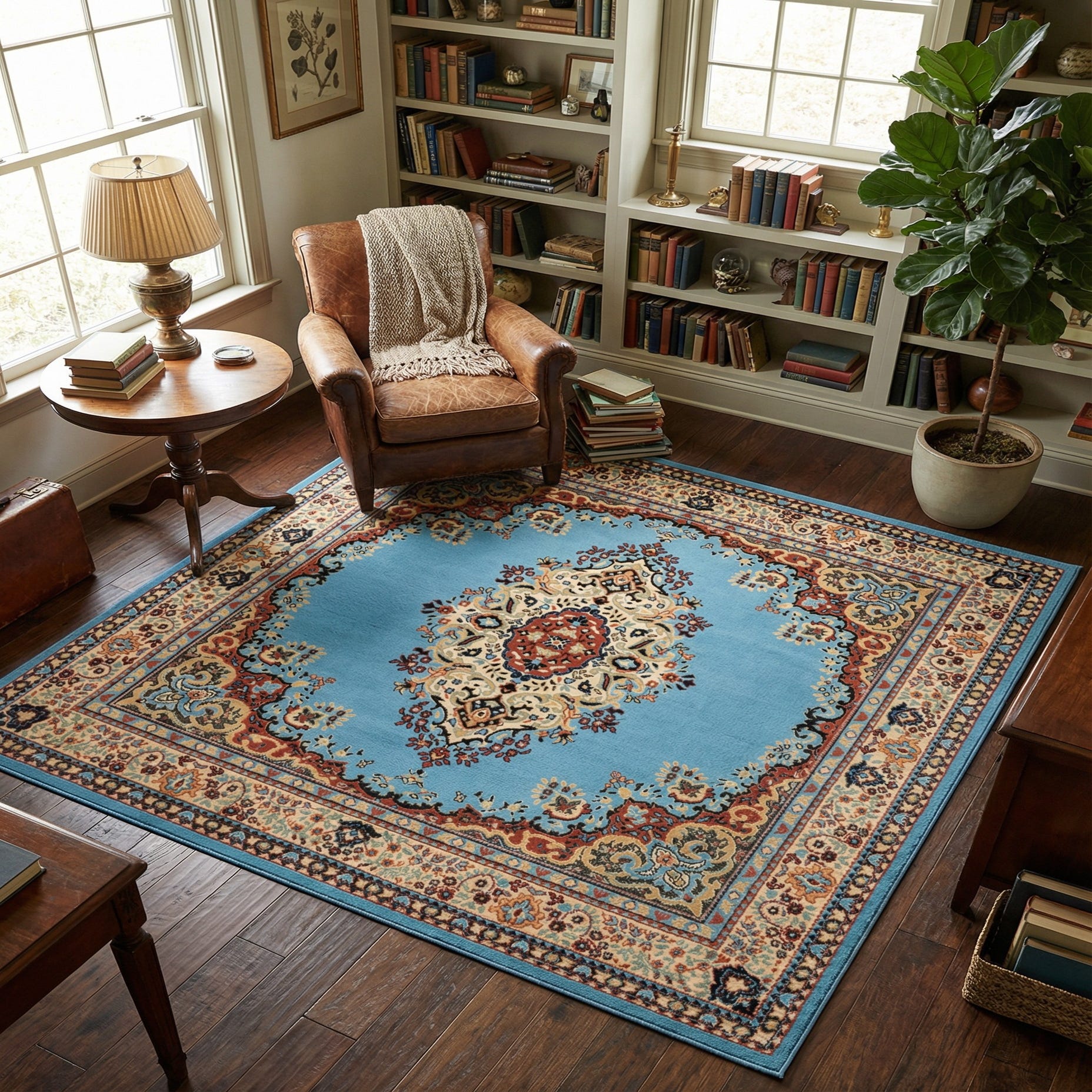This colorway and pattern work well in living rooms and bedrooms where the rug can act as a focal anchor beneath seating or a bed, or beneath a dining table to introduce pattern without overwhelming the space. Pair it with warm wood tones, navy or cream upholstery, and brass or antiqued metal accents for a traditional or transitional scheme; the light blue background also complements coastal and cottage interiors when combined with white trim and natural textures.