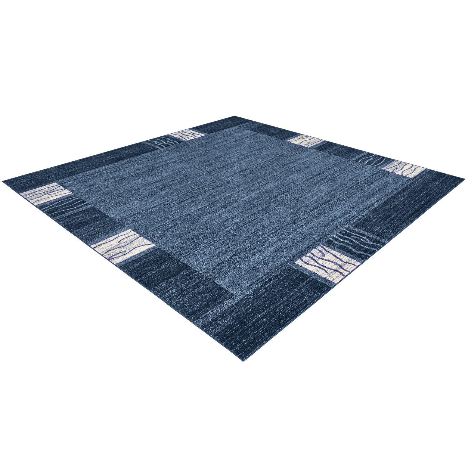 A modern, tonal field sits at the center of this square rug, its light blue ground gently shaded with subtle striations of blue and navy that create soft visual texture. A deep navy border frames the piece, punctuated by ivory rectangular insets stamped with flowing, wave-like lines for a simple geometric contrast. Machine made of 100% polypropylene, the low-profile pile feels smooth and slightly firm underfoot, offering a consistent hand and a muted, low-sheen finish that highlights the layered blues.