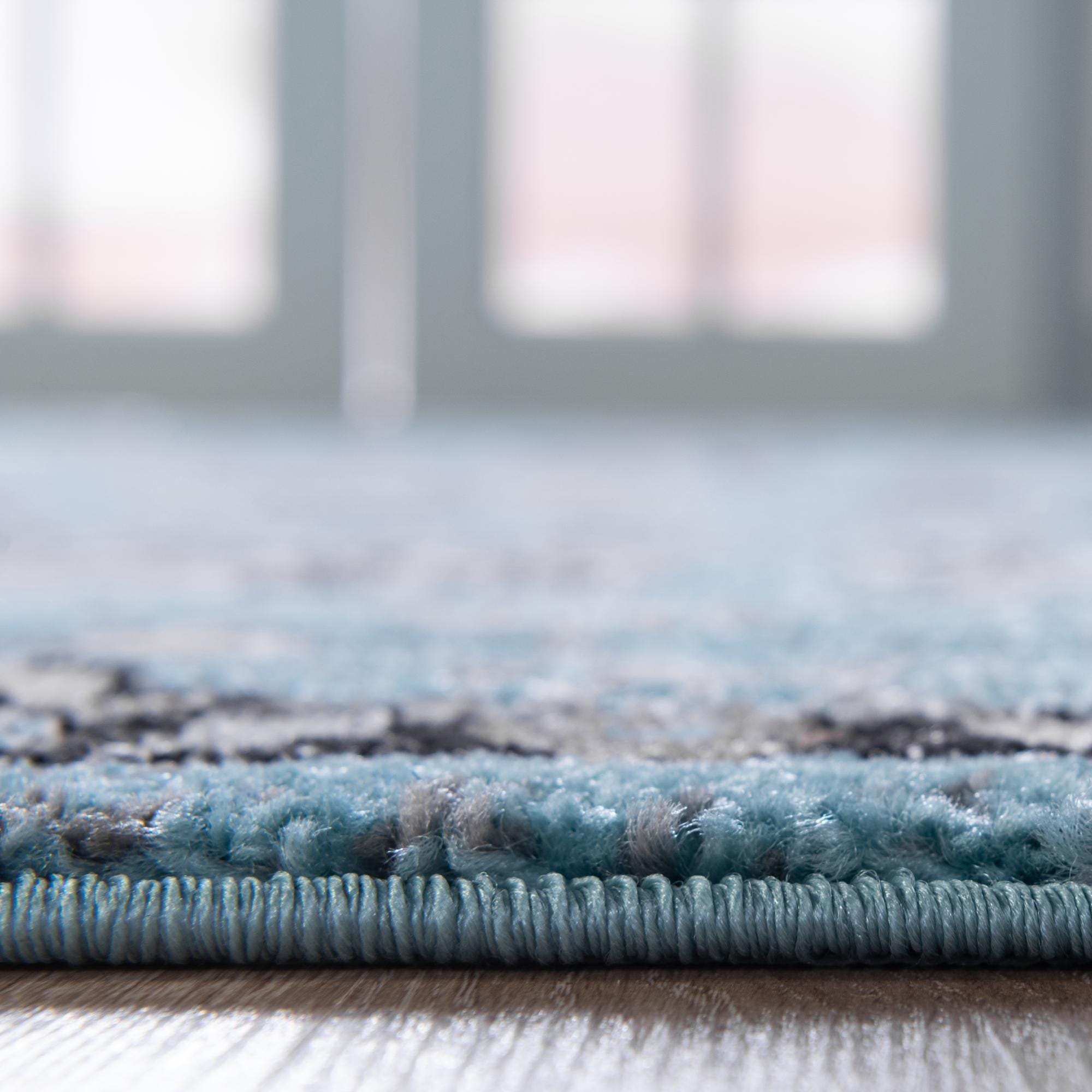 Primary color is Light Blue. Colors in this rug include: Light Blue, Black, Gray, Ivory, Silver.