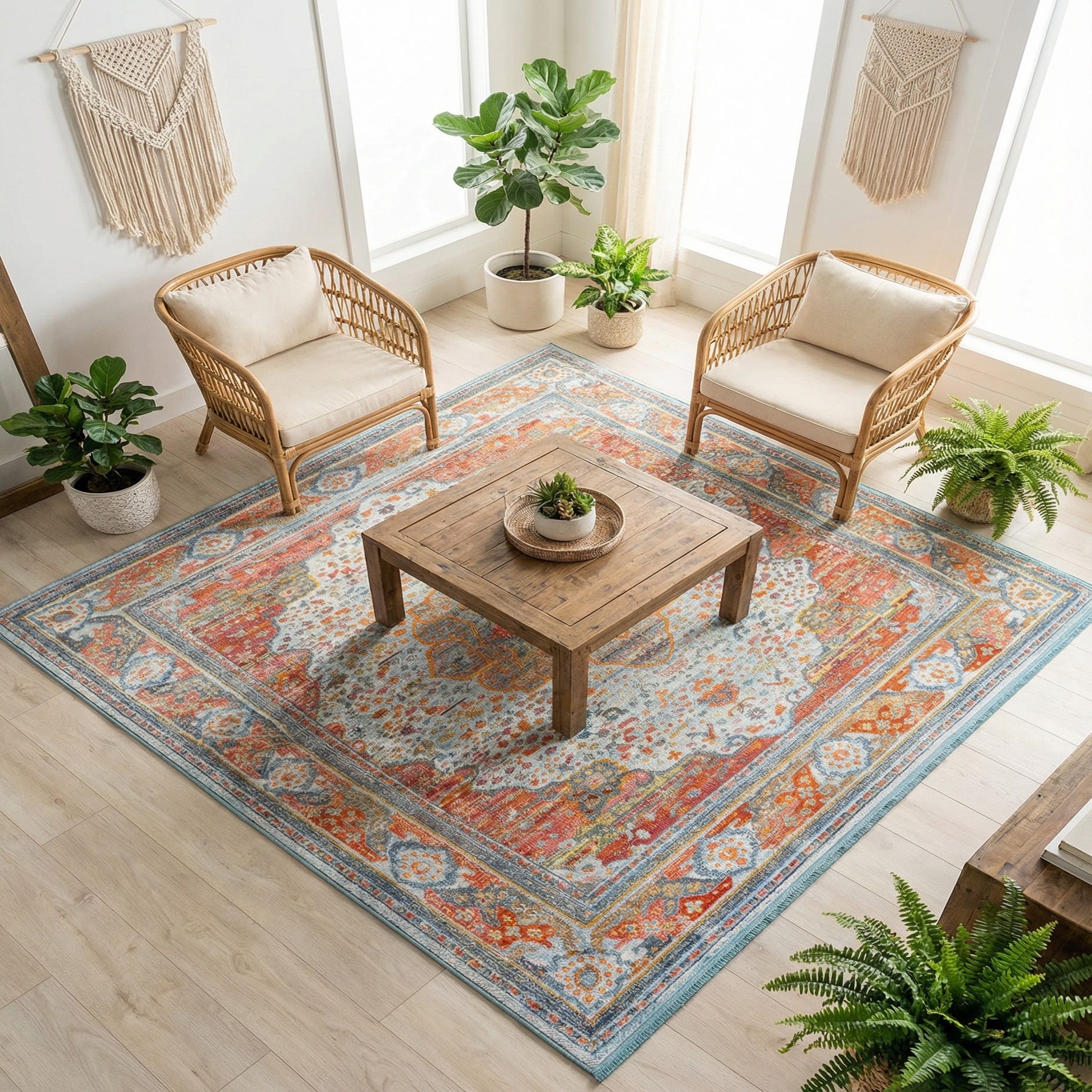 This palette and pattern work well in a range of interiors: place it beneath a coffee table in a bright living room to introduce color without overpowering existing furnishings, center it in a bedroom to add a layered, relaxed look, or use it in a casual dining area to tie together rattan, natural wood, and linen textiles. It pairs especially well with light-painted walls, white or bleached wood furniture, and accent pieces in coral or turquoise for a coordinated but lively scheme.