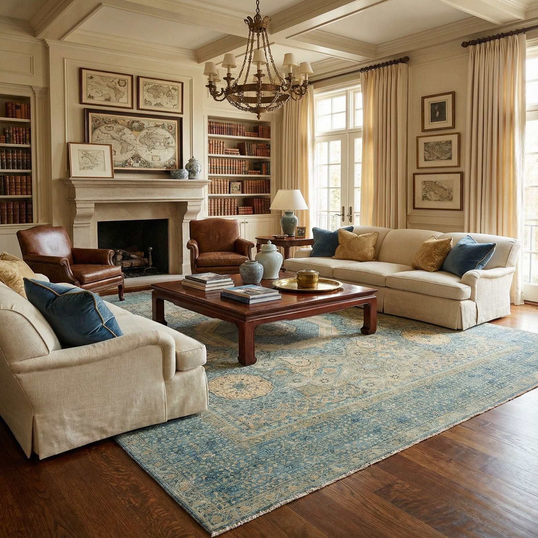 The rug's elegant color palette and classic styling make it well-suited for decor scenarios that range from traditional to transitional. It would seamlessly integrate into a living room with classic wood furnishings, add a calming presence in a bedroom with minimalistic decor, or serve as a sophisticated foundation in a home office. The versatility of this rug's design allows it to be a focal point or a complementary element in various interior design themes.