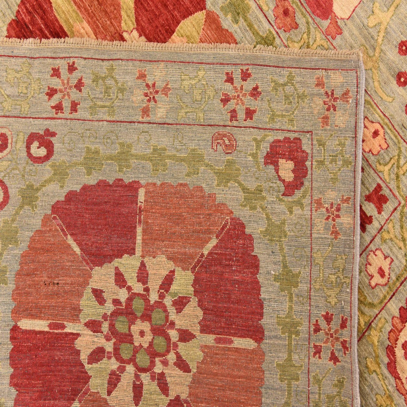 The Ariana Ziegler rug is adaptable to various interior styles. It pairs well with traditional decor, acting as a centerpiece in a living room or dining area, its rich color palette echoing antique charm. Equally, in transitional spaces, it may serve as an anchor piece that bridges modern and classical elements. Its artisanal quality would be especially appreciated in an environment where craftsmanship is celebrated, such as a library or study. The light blue background, complemented by warm tones, also allows for integration into spaces that aim for a calm and inviting atmosphere.