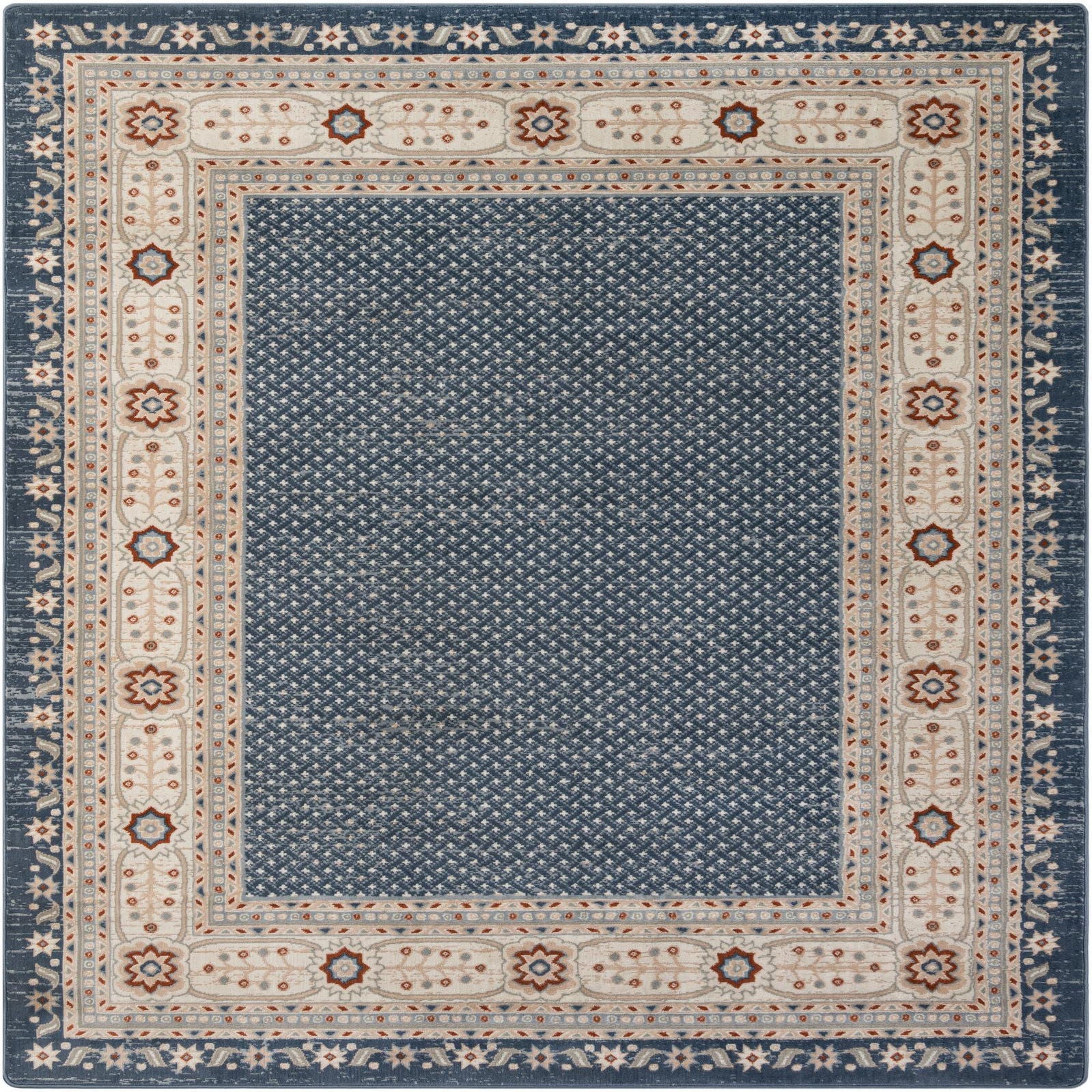 A rectangular 8x10 modern rug with a light blue patterned center and a wide border featuring floral and geometric motifs in cream, beige, and blue.