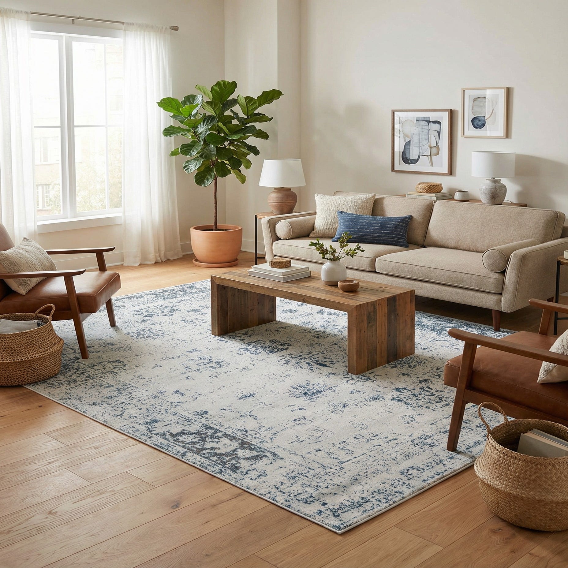 The texture provides a visual softness that complements its practicality, being shed-free and easy to maintain. This rug's calming hues and subtle pattern make it a versatile choice. It can be effectively placed in a living room to anchor a seating area, in a bedroom to add a soothing touch, or in a dining room where it can pull together elements of the space without overwhelming with bold colors or designs.