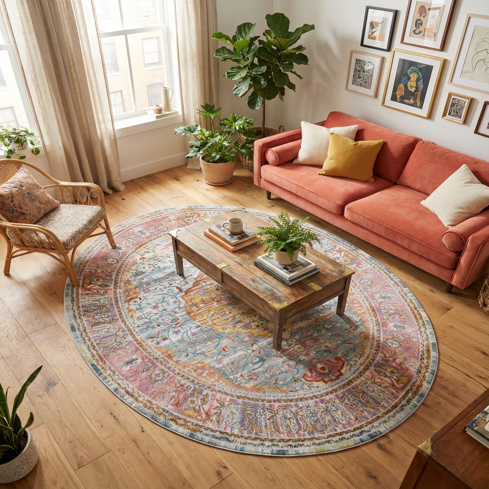 This piece works well as an anchor for a relaxed living area, positioned beneath a coffee table to introduce color and pattern without competing with furniture lines, or under a round dining table to reinforce a softer, more intimate dining arrangement. It also pairs nicely with whitewashed or honey-toned wood, navy or slate upholstery, and brass or gold accents for a balanced, layered look—equally at home in eclectic, transitional, or coastal-inspired interiors.