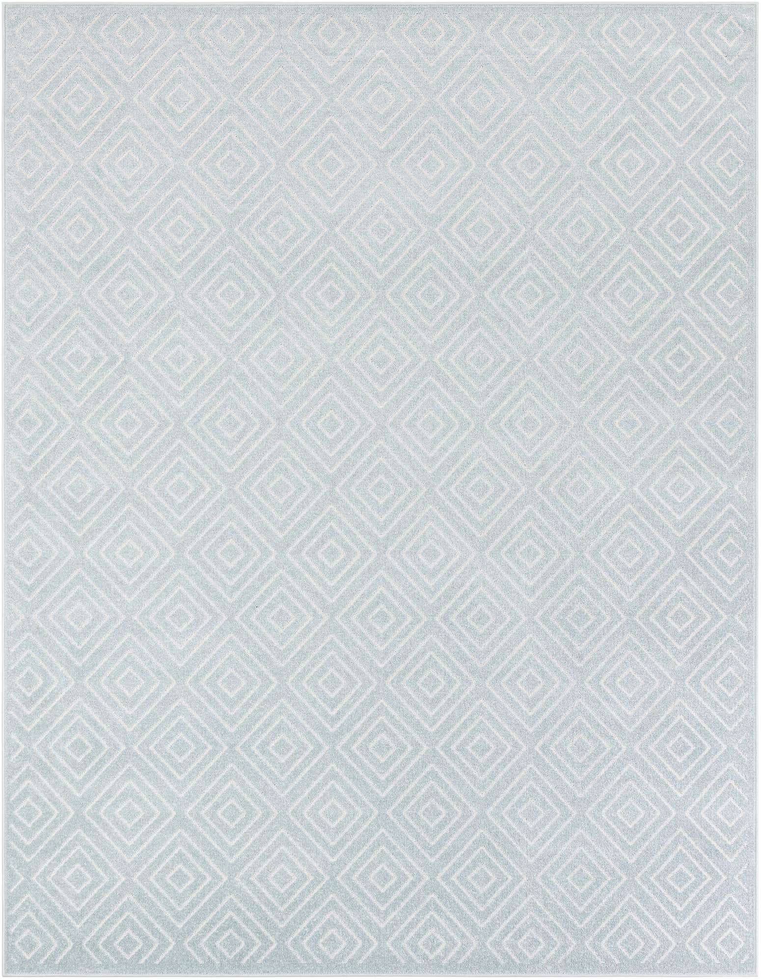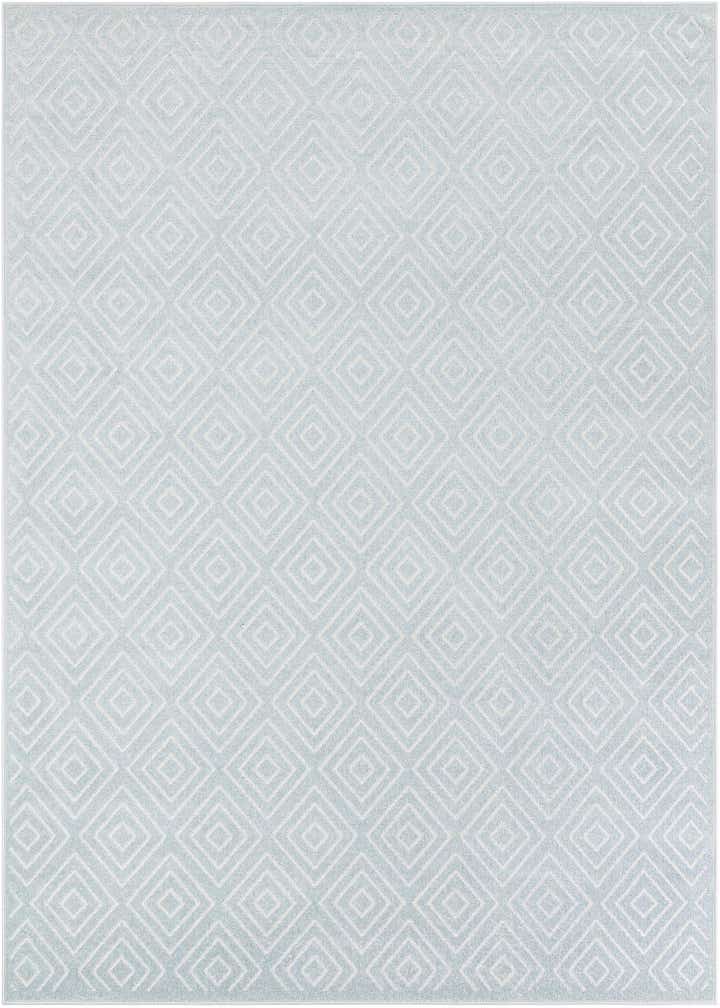 A subtle geometric diamond motif in ivory sits against a light blue background, creating a calm, airy look that brings quiet pattern without overpowering a room. Machine made from 100% polypropylene, the rug has a low-profile, flat-woven texture with a slight tactile contrast where the ivory pattern lifts gently from the blue field. The result is a crisp, durable surface with a soft hand that feels smooth underfoot while maintaining outdoor-ready performance.