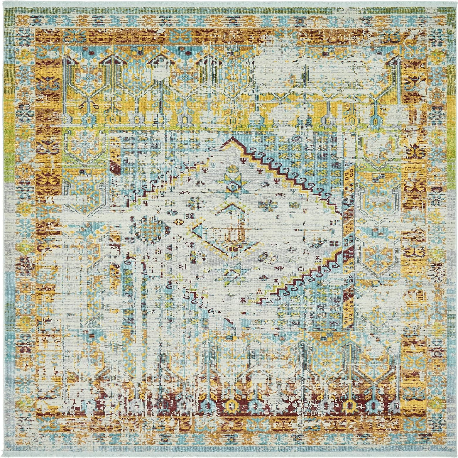 Primary color is Light Blue. Colors in this rug include: Light Blue, Beige, Blue, Cream, Green, Tan, Red, Yellow.