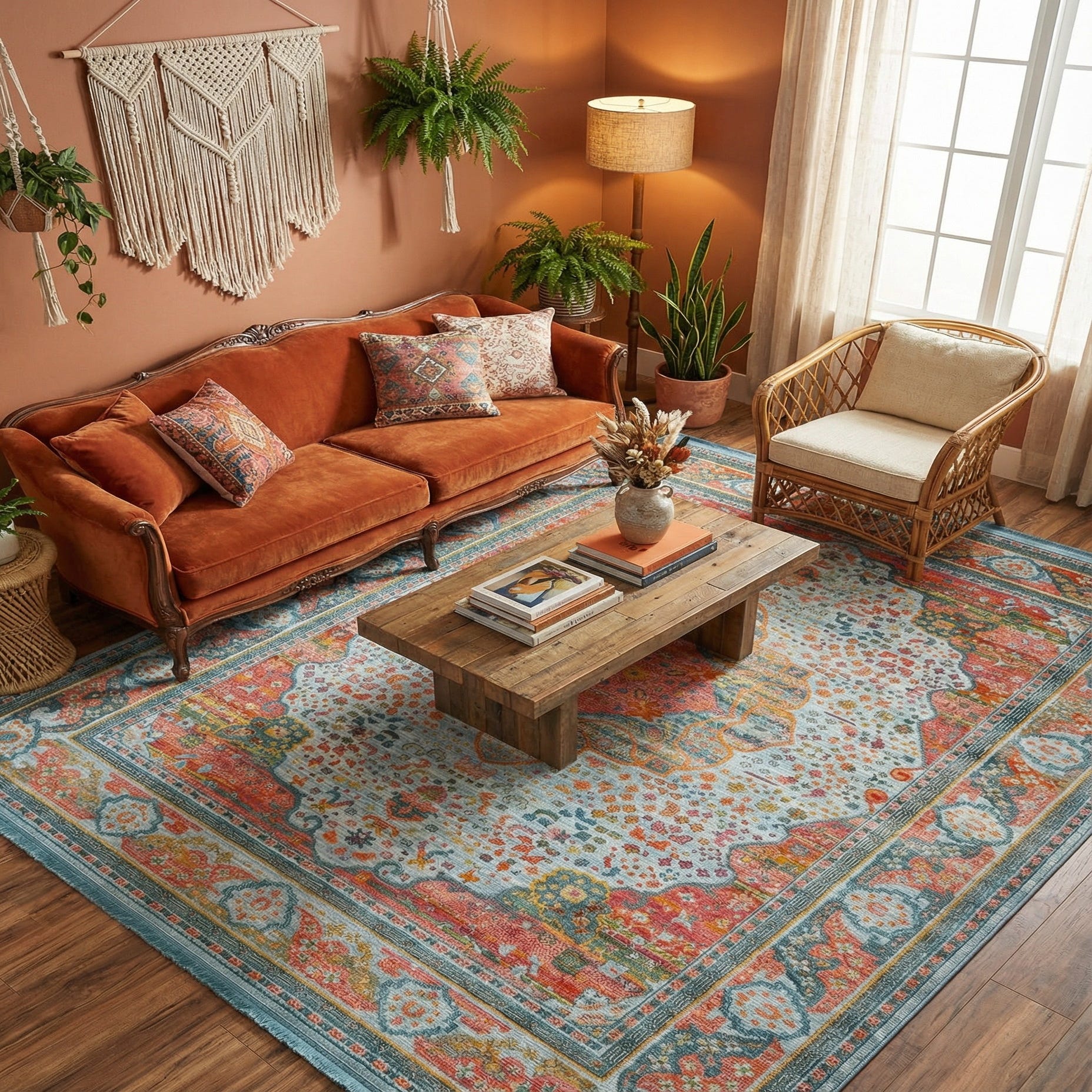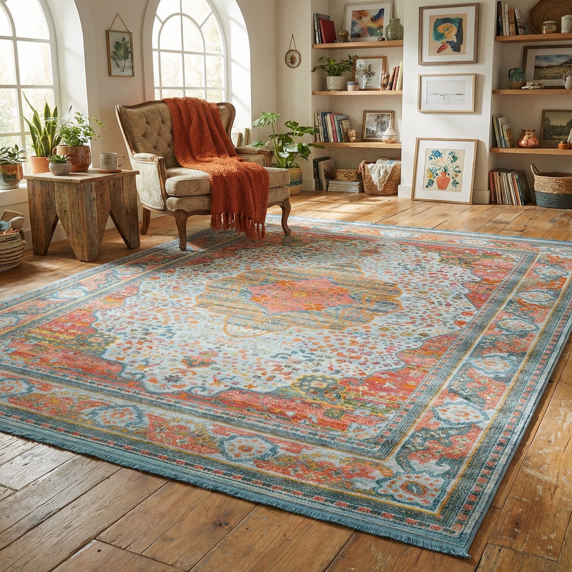 Light blue forms the rug’s background, anchoring a layered medallion design in pink, orange, turquoise and ivory. A scalloped central medallion and finely detailed border are softened by a slightly weathered, color-washed effect, with scattered floral and dot motifs that add movement across the field. Warm orange and coral accents pop against the cool turquoise and light blue, creating a balanced, lived-in look that feels both fresh and familiar.
