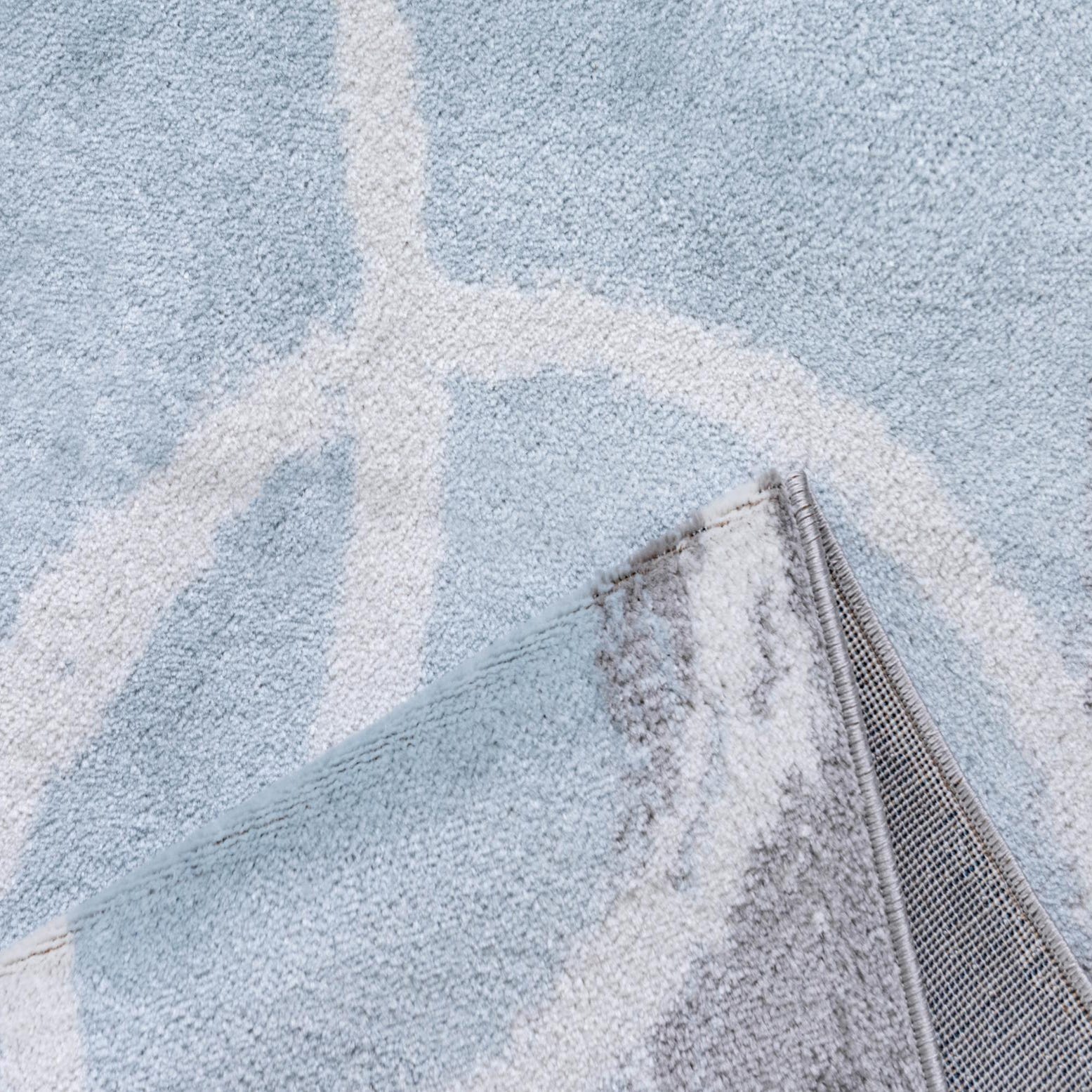 A contemporary abstract design anchors this rug, with a light blue ground that feels fresh and calm. Overlapping ivory rings sweep across the surface in a loose, painterly motif while a soft gray wash frames the composition and introduces subtle, distressed edges and horizontal striations for added depth. Machine made from 100% polypropylene, the rug has a low-profile pile with a smooth hand and a gentle sheen that offers comfortable footing and a clean, tailored appearance.