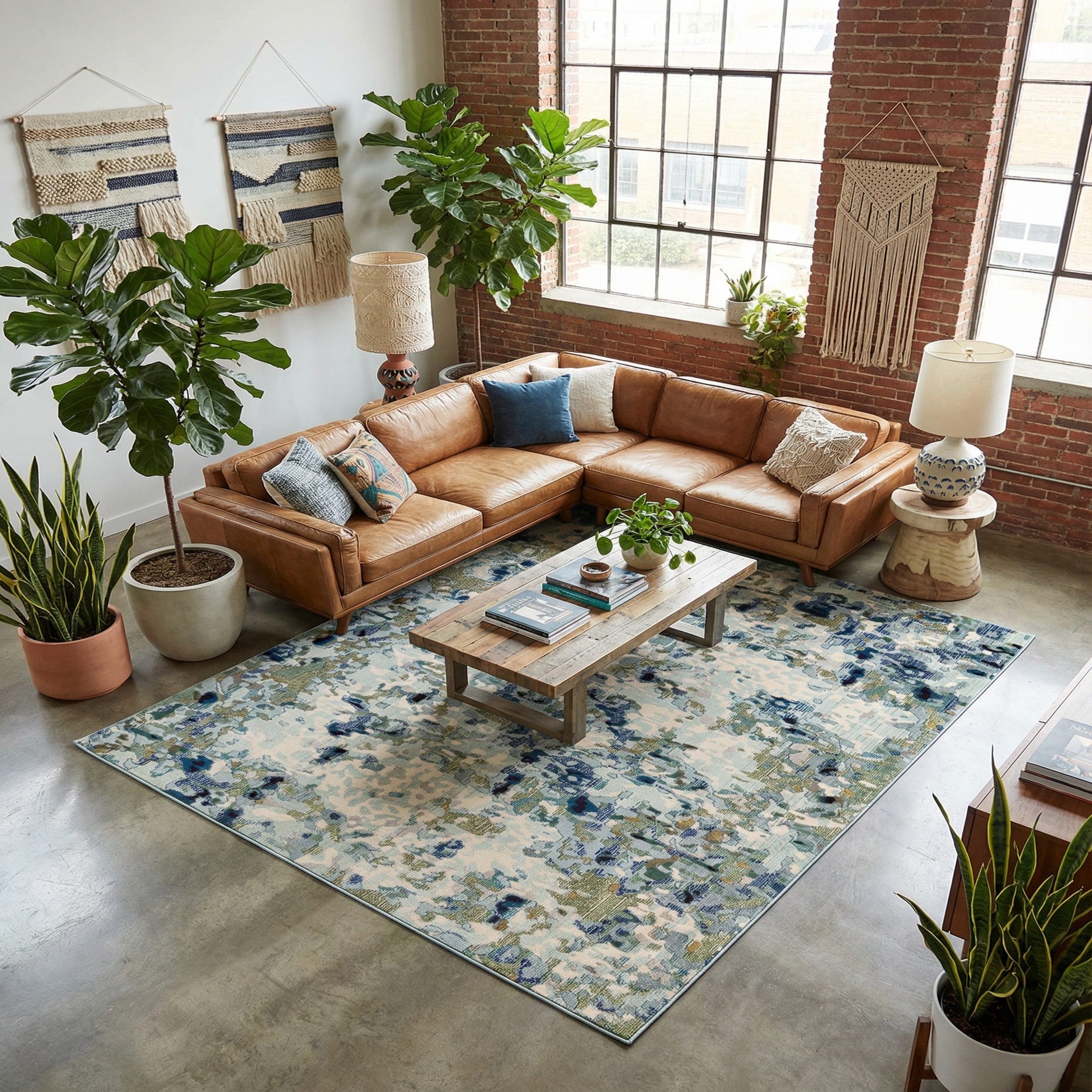 Machine-made from 100% polypropylene, this rug combines the look of hand-drawn, contemporary art with practical construction. It works well anchoring a living room seating area beneath a linen sofa, adding coastal or modern farmhouse character to a bedroom, or softening a home office with cool, calming tones. Pair it with natural wood furniture, navy accents, or light neutral textiles to highlight the layered blues and greens.