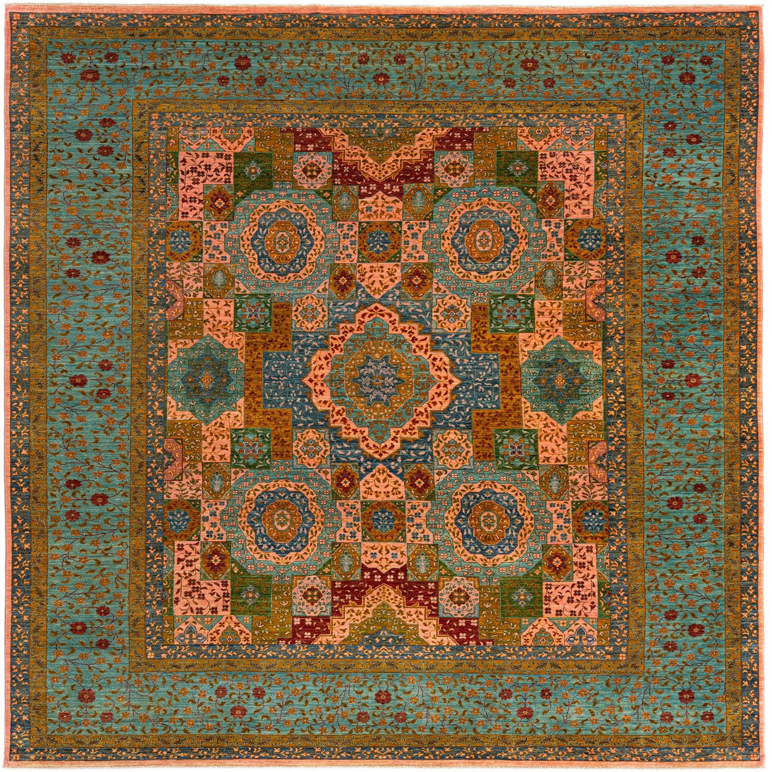 An 8x11 rectangular Persian rug in blues, peach, and gold with intricate floral and medallion patterns.