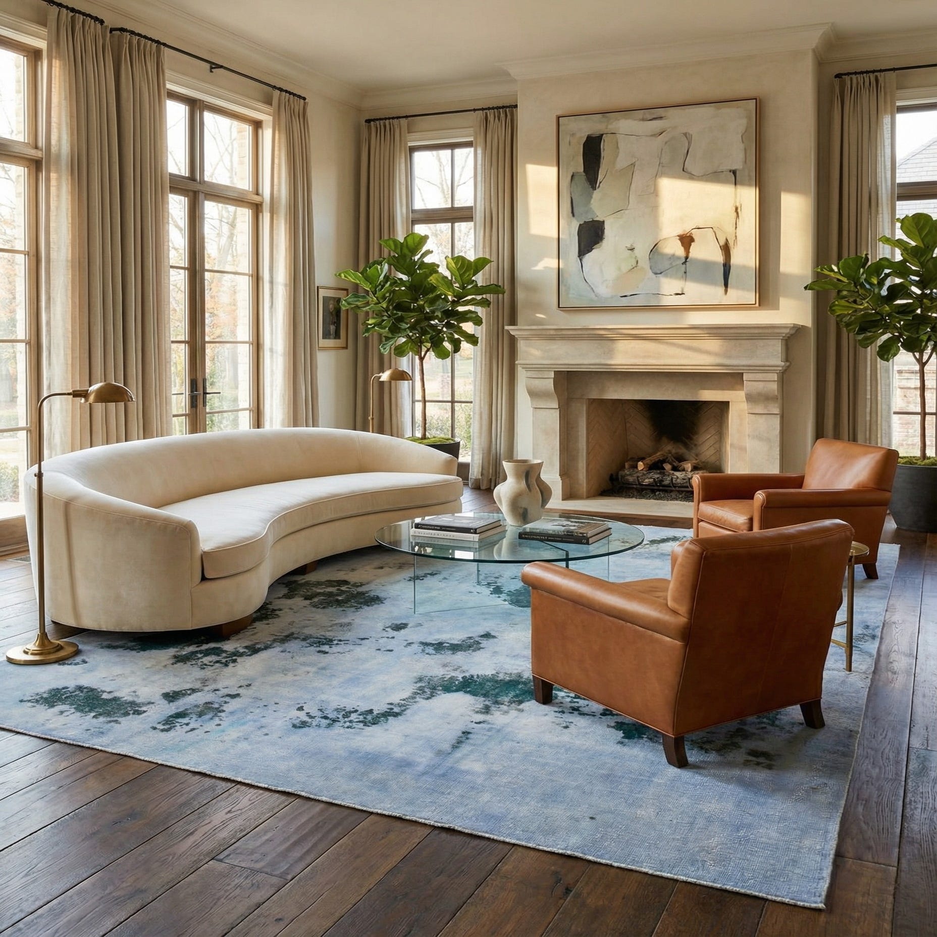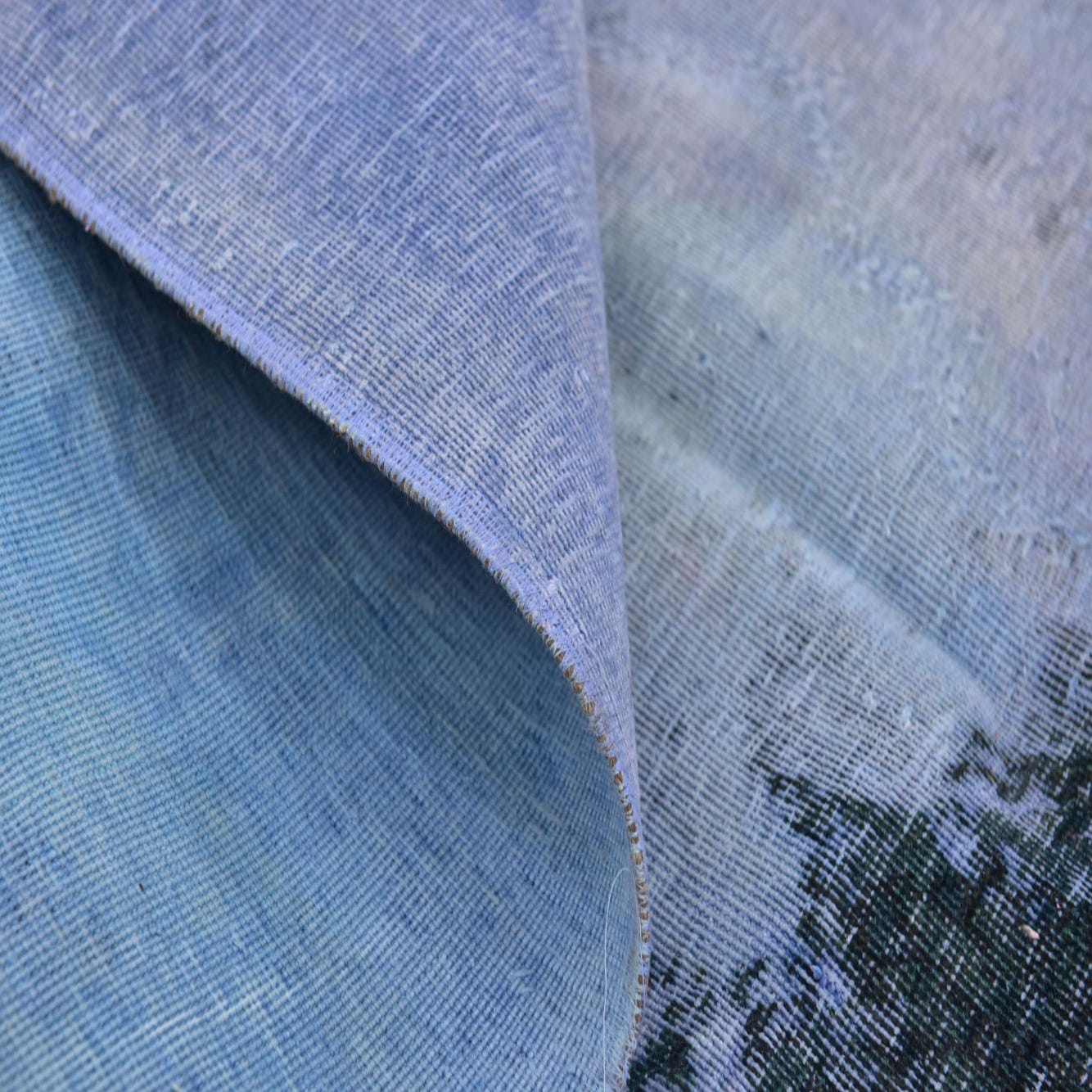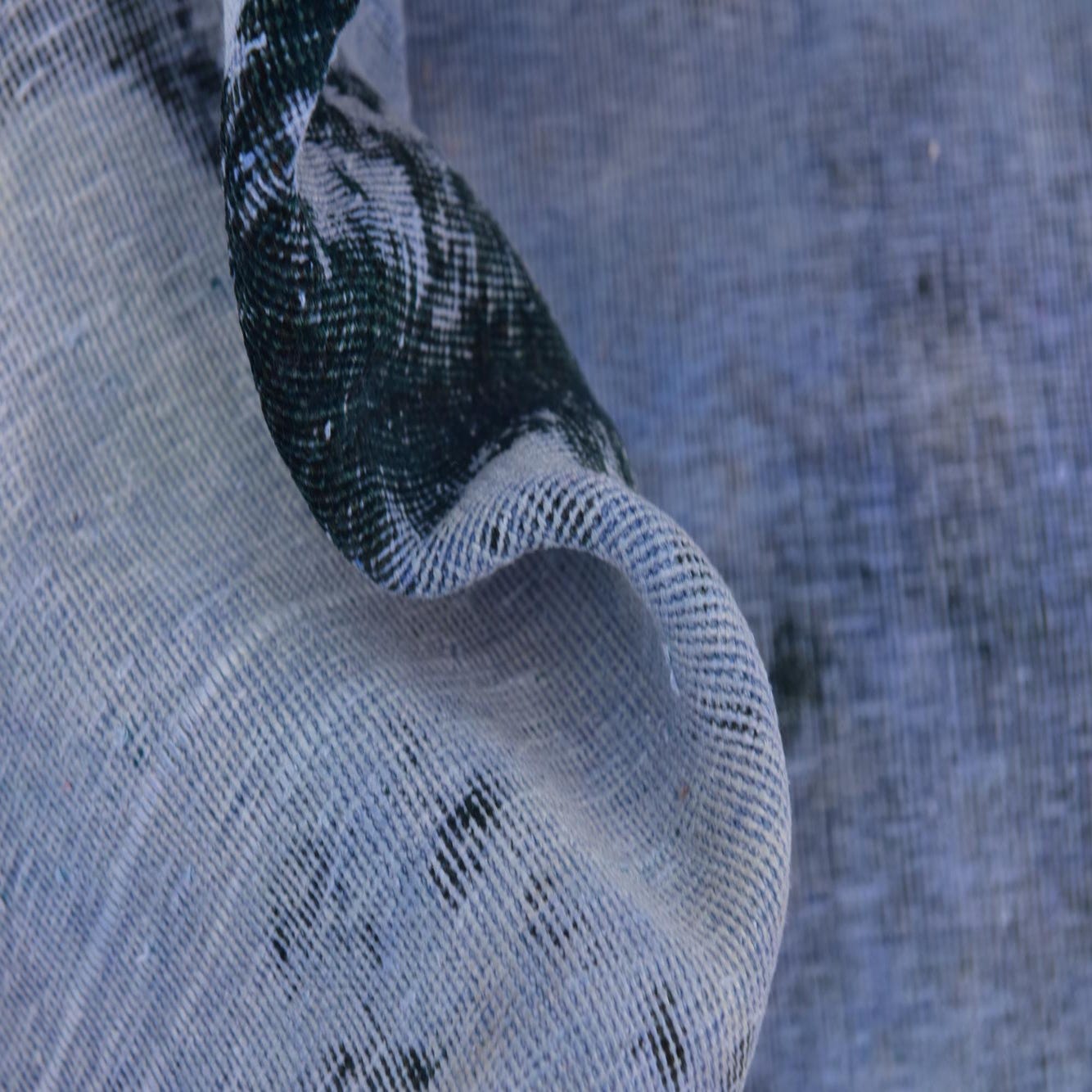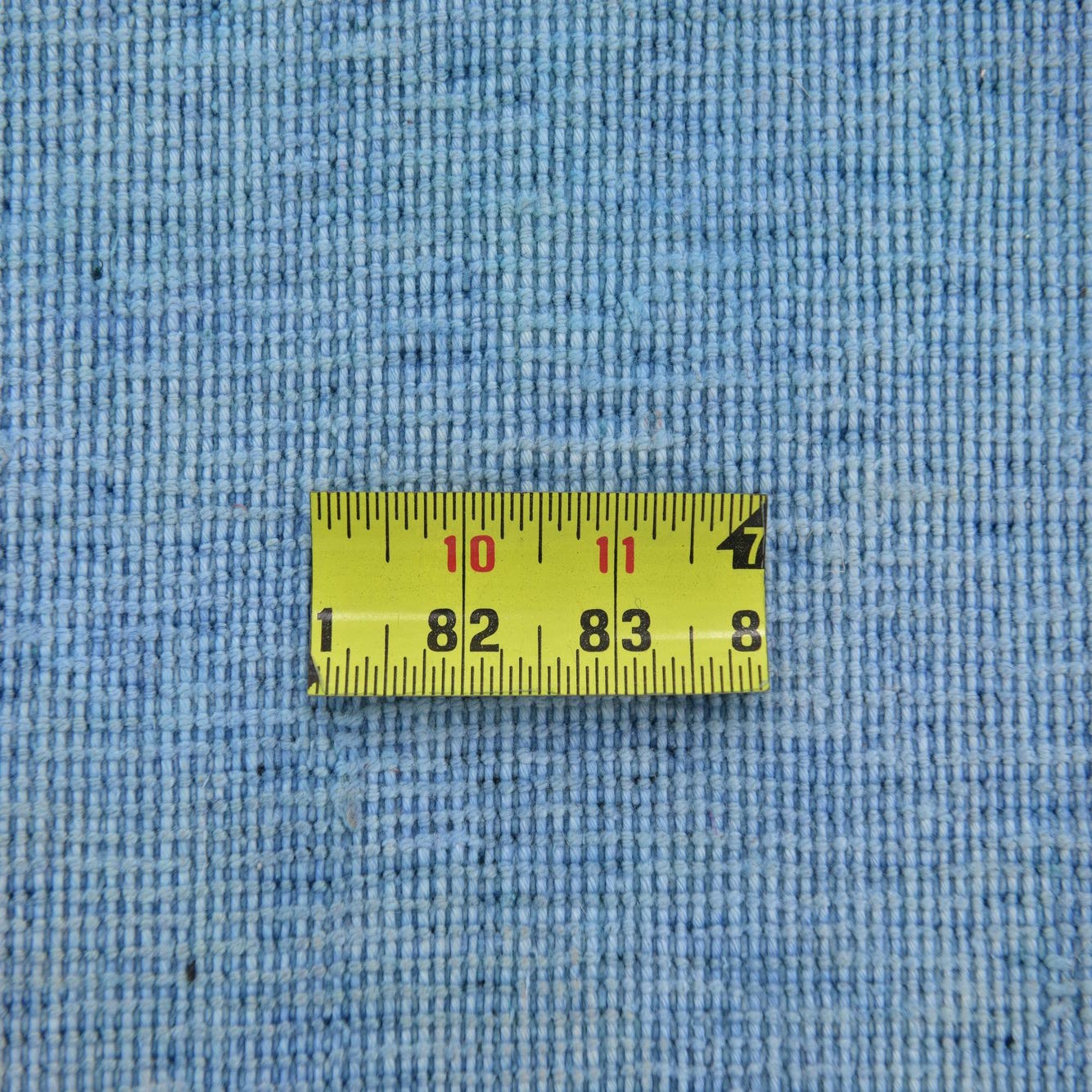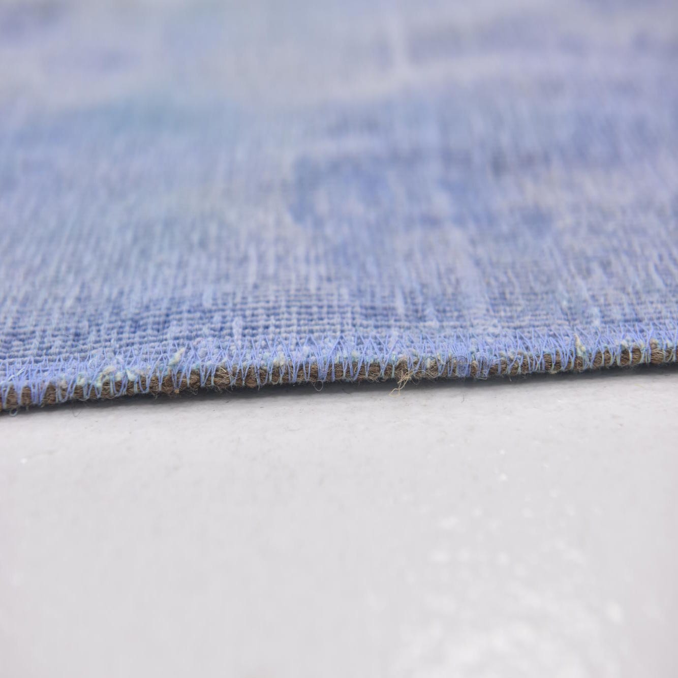 A rectangular 8x12 light blue wool rug with a distressed abstract pattern in darker blue and hints of green, suitable for an indoor living space.