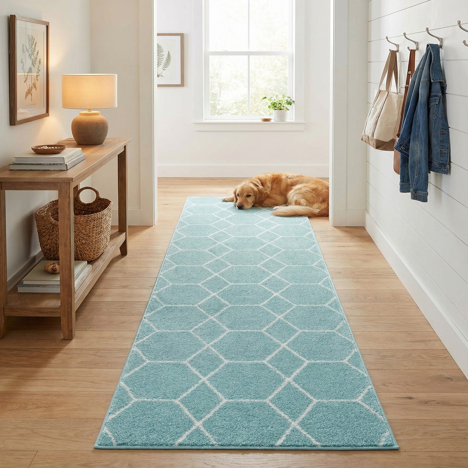 A 9 ft runner rug in light blue with a white modern trellis pattern, ideal for a hallway.
