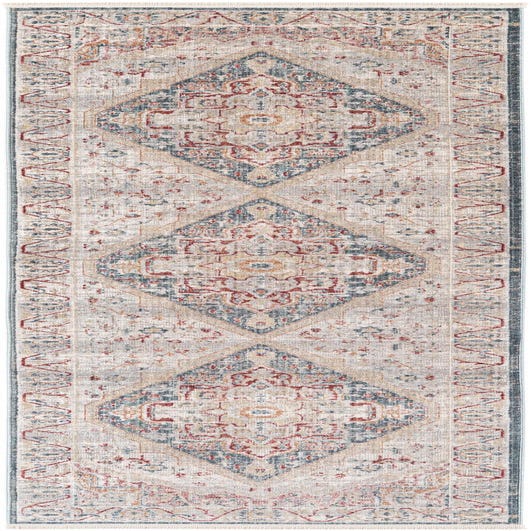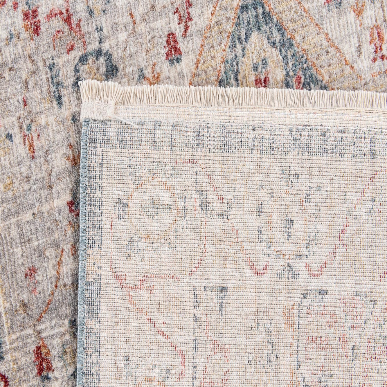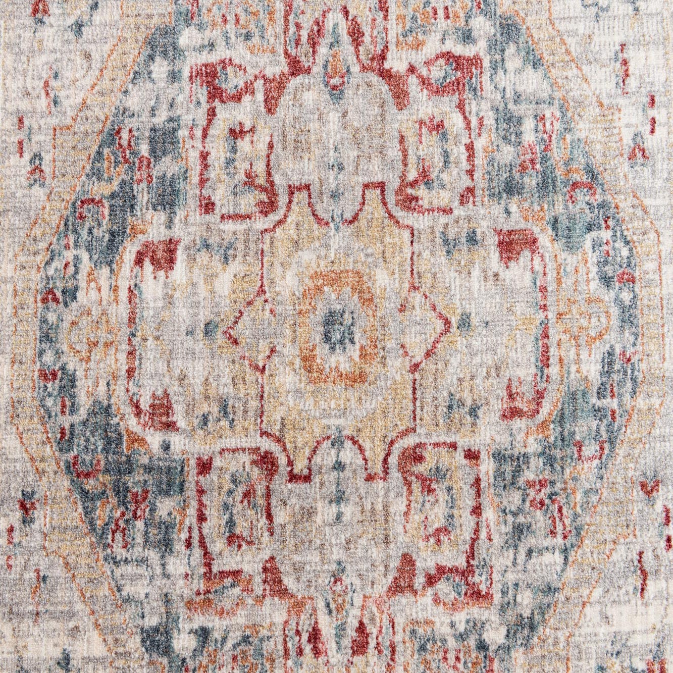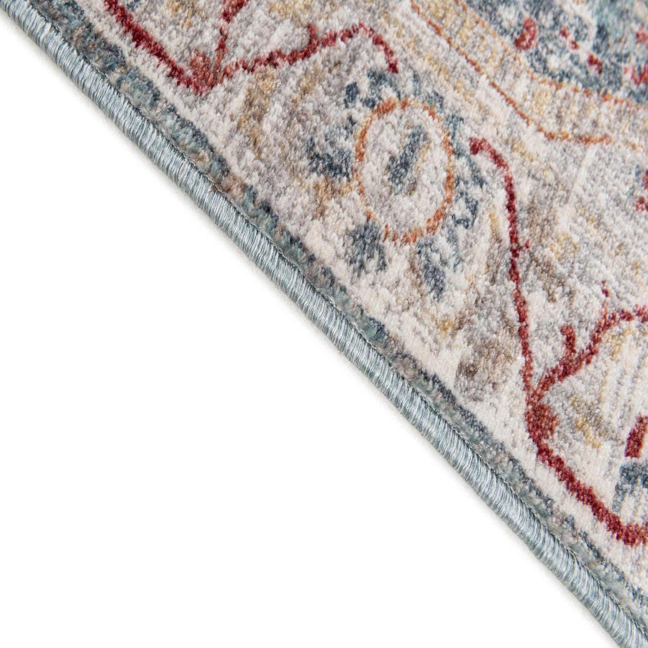 Primary color is Light Blue. Colors in this rug include: Light Blue, Red, Gray, Ivory, Yellow.