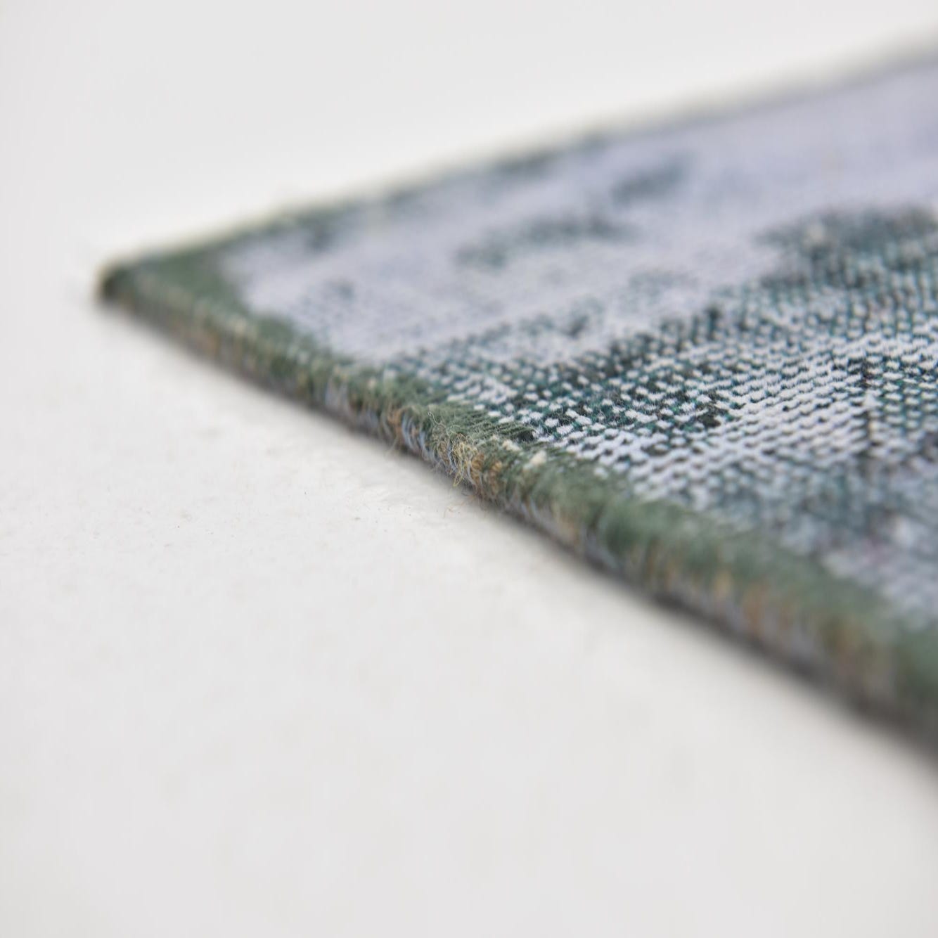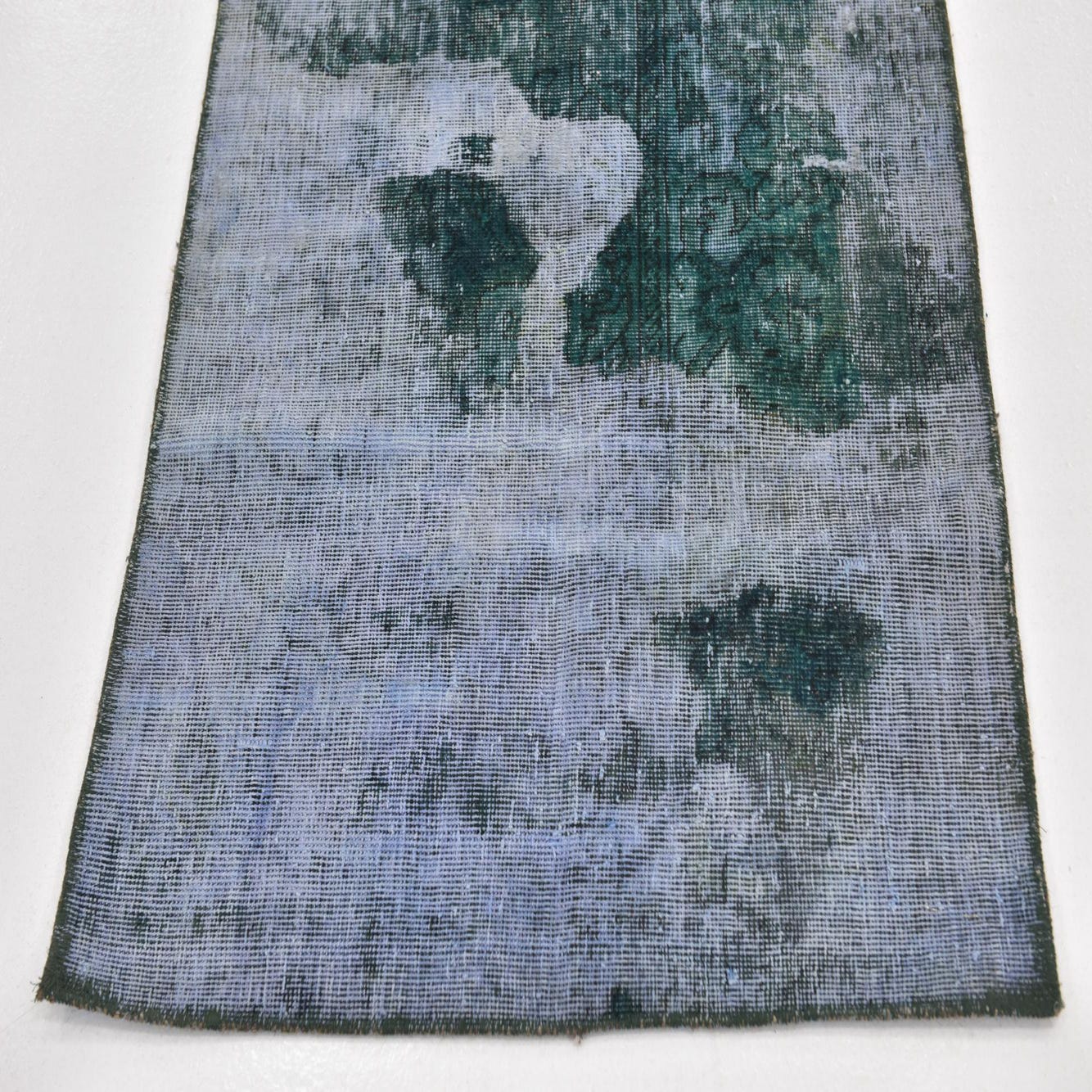 A 9 ft runner rug with a distressed blue and teal abstract pattern, perfect for a hallway.