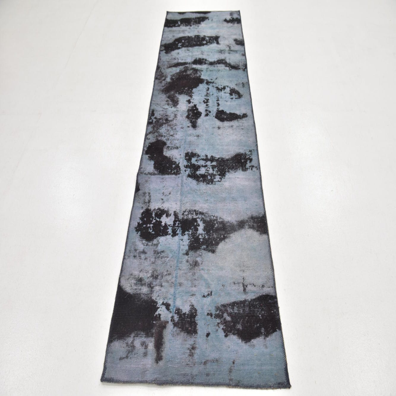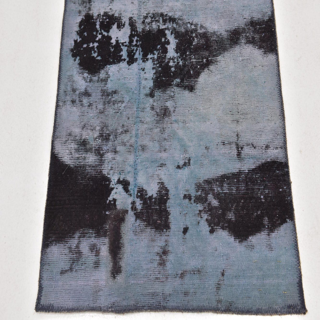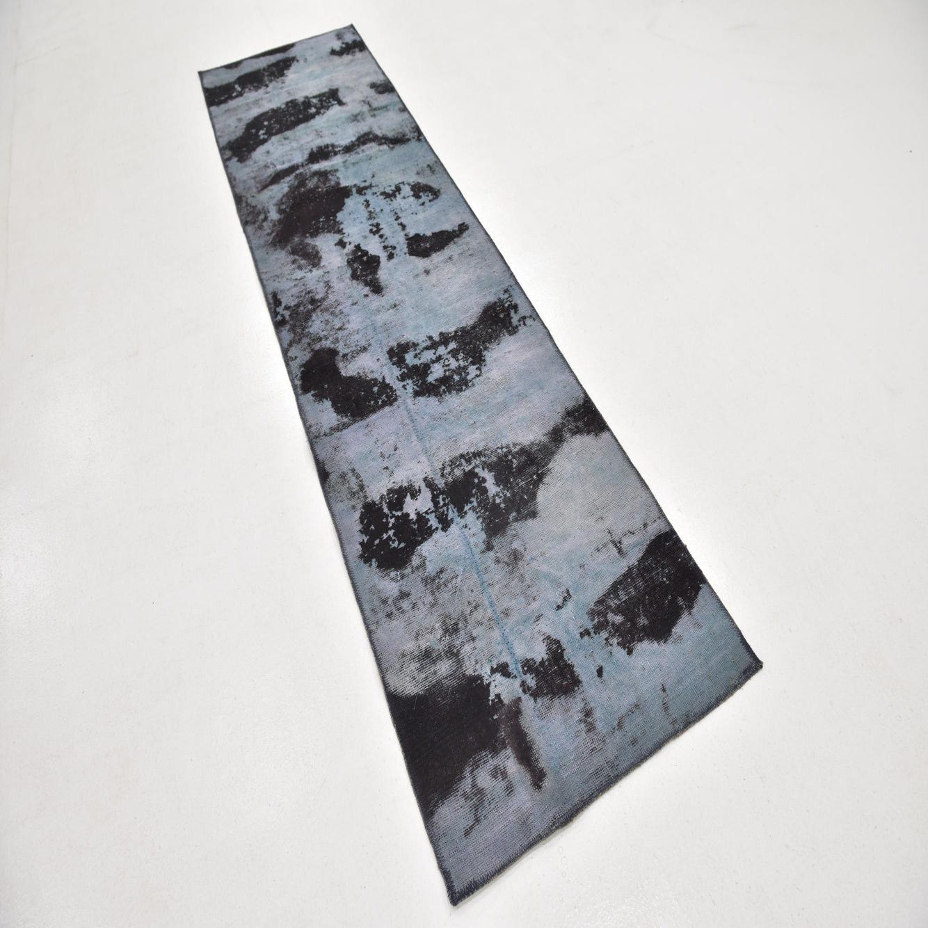 This Ultra Vintage collection 9 Ft runner is hand-knotted of 100% wool, offering both durability and a smooth, plush texture underfoot. The design showcases a modern, abstract pattern consisting of swaths and splatters that imbue the piece with a dynamic, artistic sensibility. The color palette includes deep shades of black and blue that contrast strikingly against a soothing light blue background, providing a captivating visual landscape.