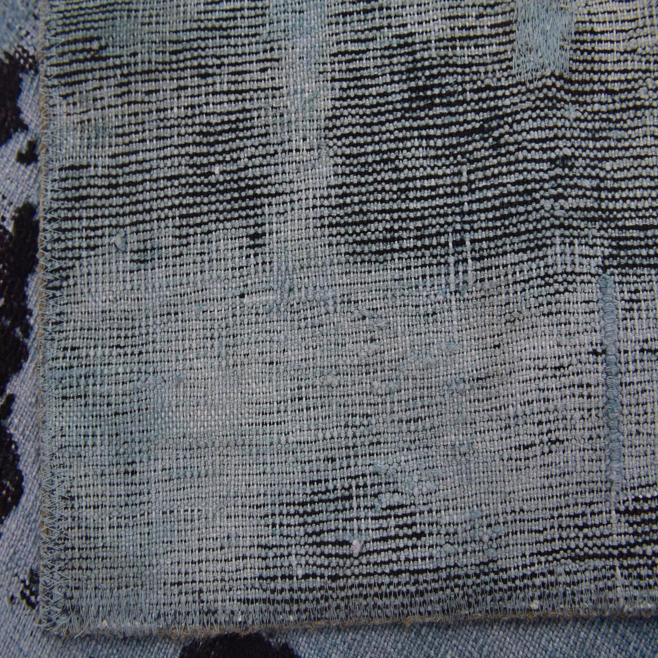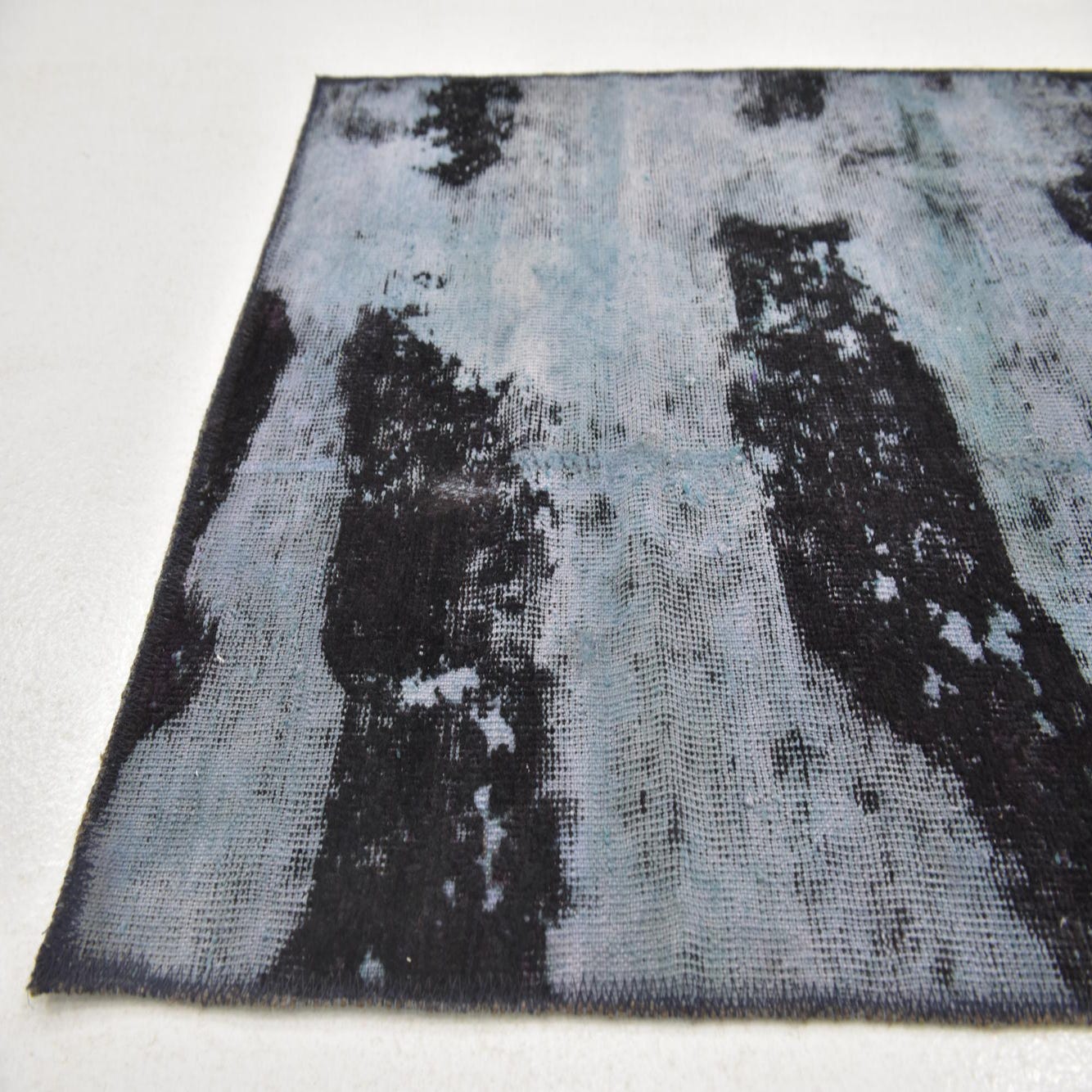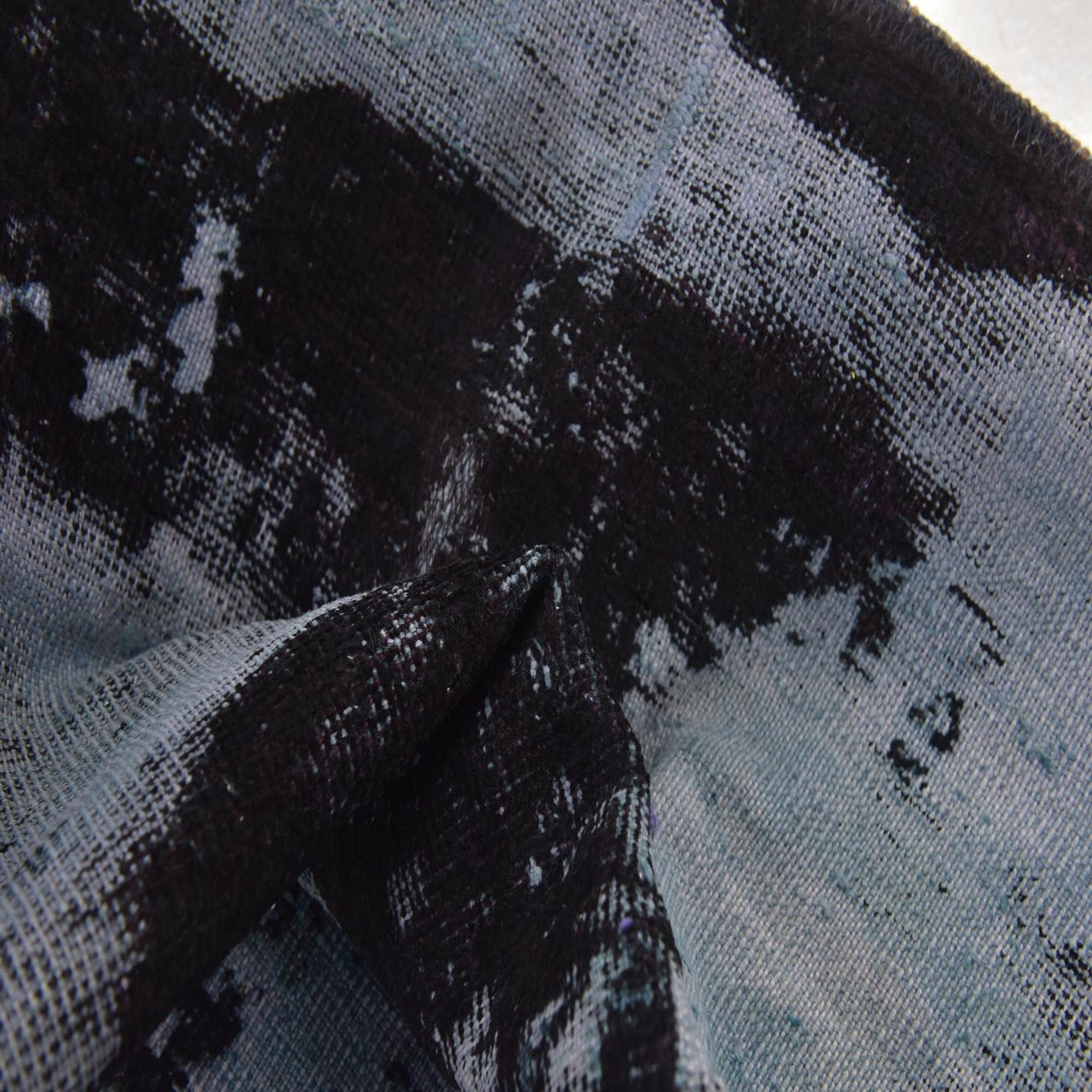 This Ultra Vintage collection 9 Ft runner is hand-knotted of 100% wool, offering both durability and a smooth, plush texture underfoot. The design showcases a modern, abstract pattern consisting of swaths and splatters that imbue the piece with a dynamic, artistic sensibility. The color palette includes deep shades of black and blue that contrast strikingly against a soothing light blue background, providing a captivating visual landscape.