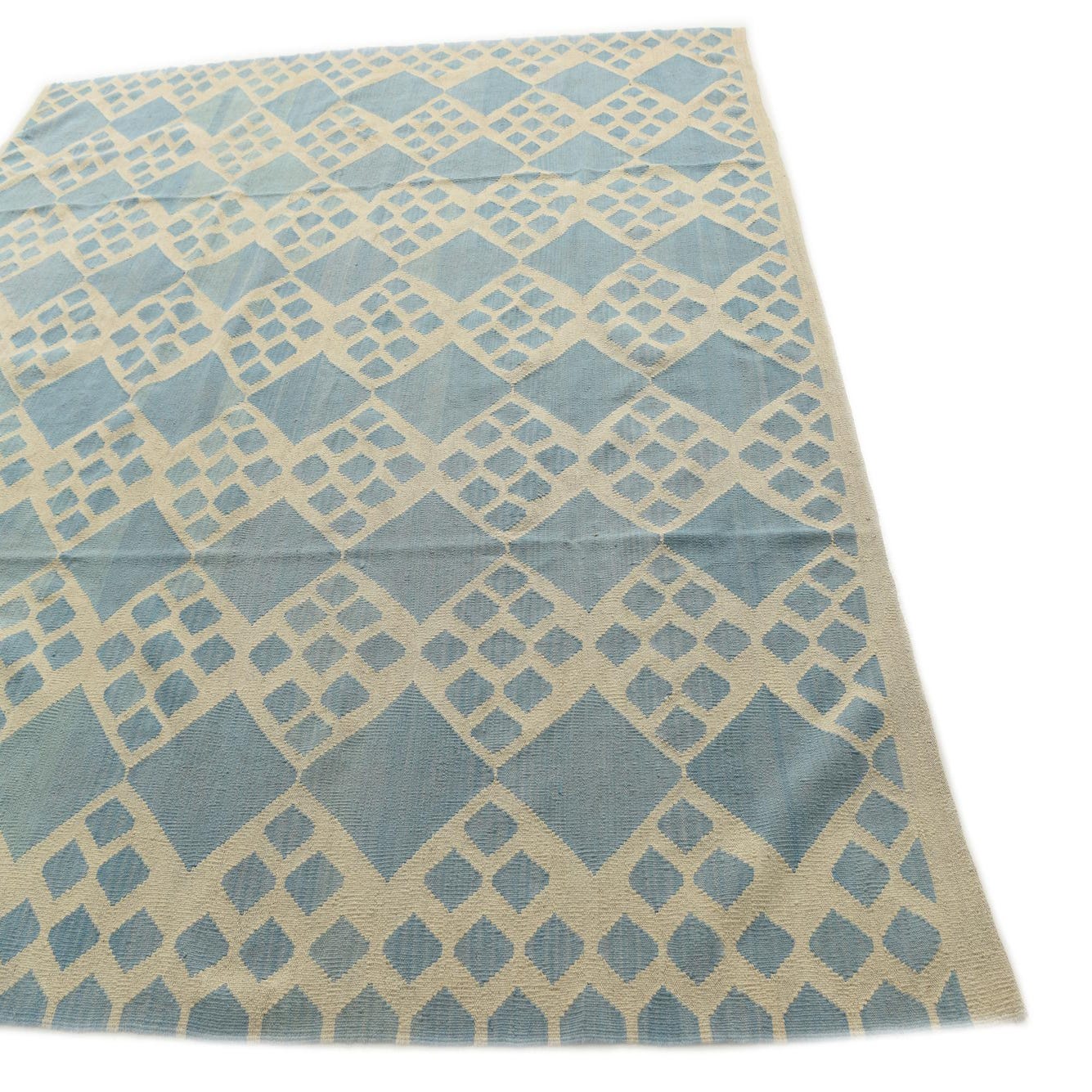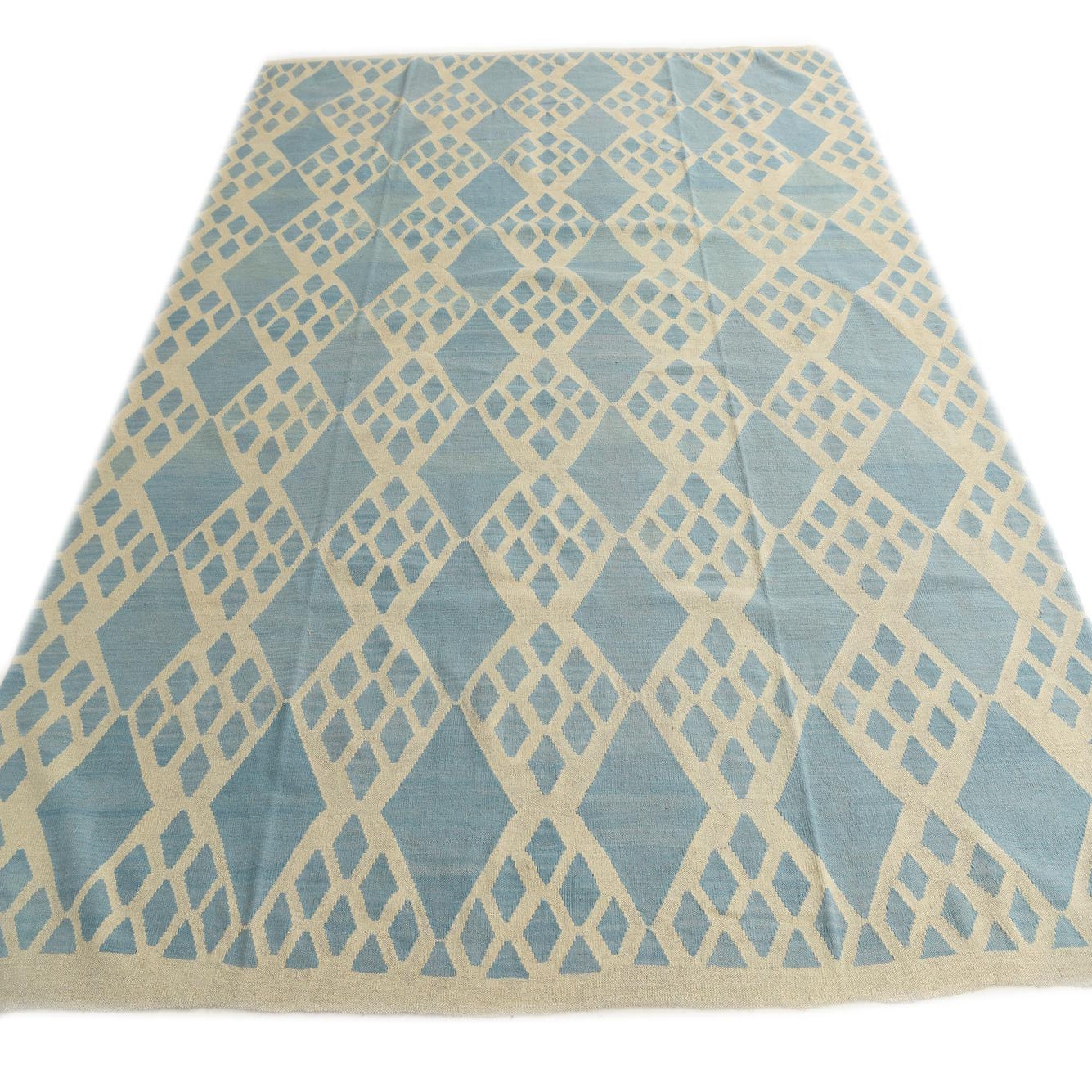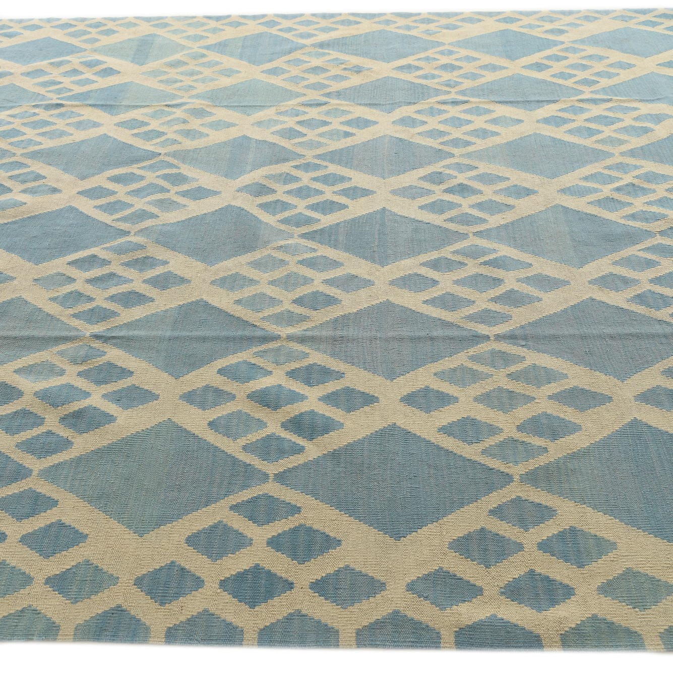 A large 8' 9 x 9' 6 square light blue and beige flatweave wool rug with a tribal diamond pattern.